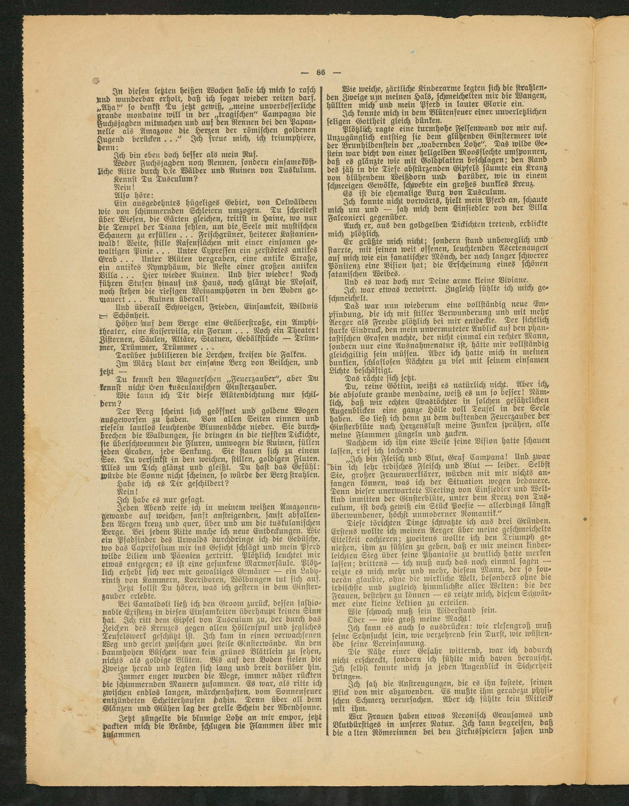 Jeden Abend reife ich in meinem weißen Amazonen- gewande auf weichen, sanft ansteigenden, sanft abfallenden Wegen kreuz und quer, über und um die tuskulanischeu Berge. Bei jedem Ritte mache idji neue Entdeckungen. Wie ein Pfadfinder des Urwalds durchdringe ich die Gebüsche, wo das Caprifolium mir ins Gesicht schlägt und mein Pferd wilde Lilien und Päonien zertritt. Plötzlich leuchtet mir etwas entgegen; es ist eine gesunkene Marmorsäule. Plötzlich erhebt sich vor mir gewaltiges Gemäuer — ein Labyrinth von Kammern, Korridoren, Wölbungen tut sich auf.