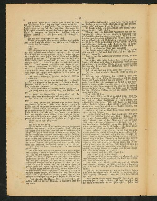 Bei Canialdoli ließ ich den Groom zurück, dessen fashio- pable Existenz in diesen Einsarukeiten überhaupt feinen Sinn hat. Ich ritt dem Gipfel von Tusculum zu, der durchs das Zeichen des Kreuzes gegen allen Höllenspur und jegliches Teufelswerk geschützt ist. Ich kam in einen verwachsenen Weg und geriet zwischen zwei steile Ginsterwände. An den baumhohen Büschen war fein grünes Blättlein zu sehen, nichts als goldige Blüten. Bis auf den Boden sielen die Zweige herab und legten sich lang und breit darüber hin.