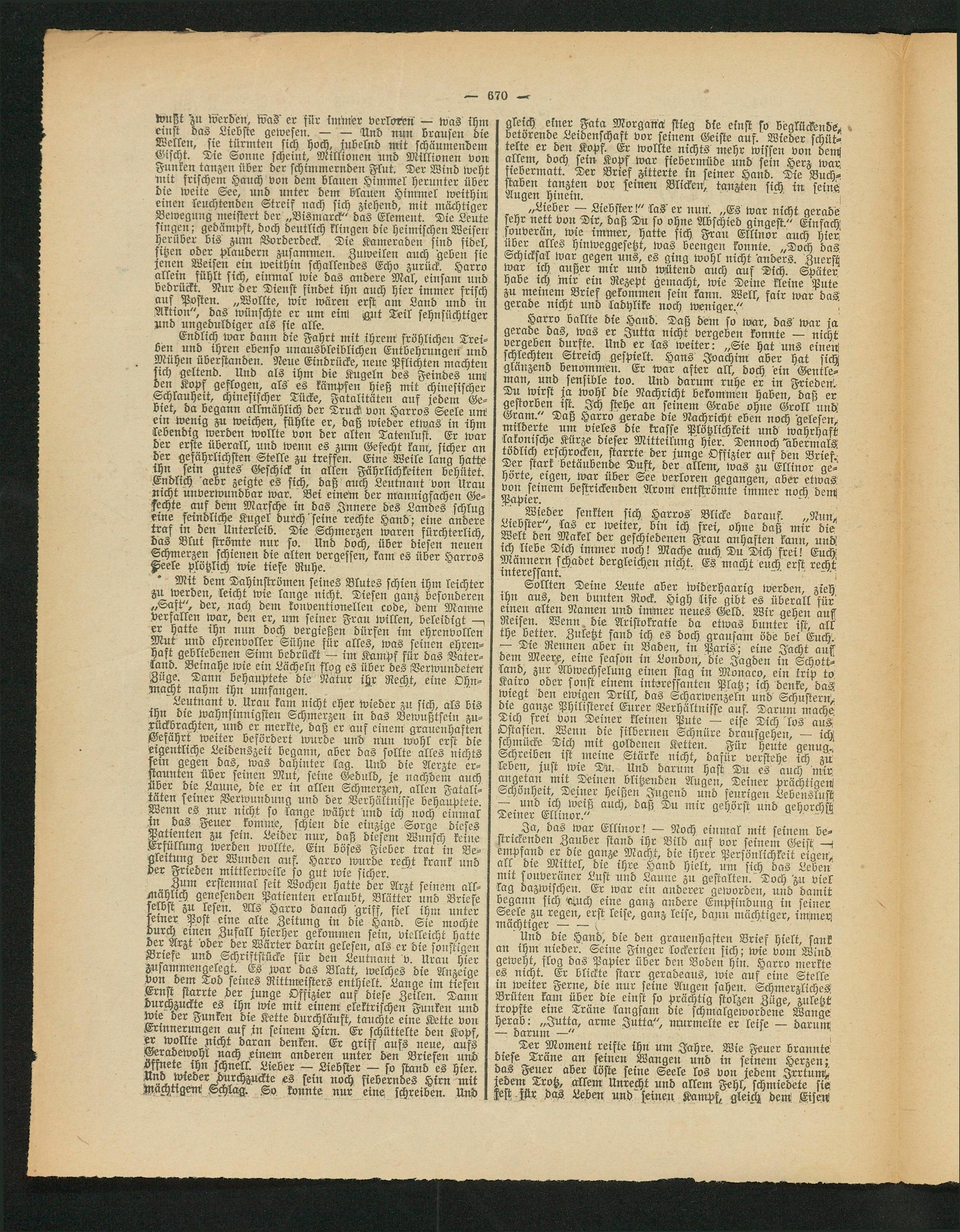 „Zum erstenmal seit Wochen hatte der Arzt seinem all- mahlich genesenden Patienten erlaubt, Blätter und Briefe selbst zu lesen. Ms Harro danach griff, fiel ihm unter semer Post eine alte Zeitung in die Hand. Sie mochte durch einen Zufall hierher gekommen sein, vielleicht hatte der Arzt oder der Wärter darin gelesen, als er die sonstigen Briefe und Schriftstücke für den Leutnant v. Uran hier zusammengelegt. Es ,ivar das Blatt, welches die Atizeige von dem Tod feines Rittmeisters enthielt. Lange im tiefen Ernst starrte ber junge Offizier auf diese Zeilen. Dann durchzuckte es ihn wie mit einem elektrischen Funken und wie der Funken die Kette durchläuft, tauchte eine Kette von Erinnerungen auf ,in feinem Hirn. Er schüttelte den Kopf, er wollte nicht daran denken. Er griff aufs neue, aufs Geradewohl nach .einem anderen unter den Briefen unb öffnete ihn schnell. Lieber — Liebster — so staub es hier.