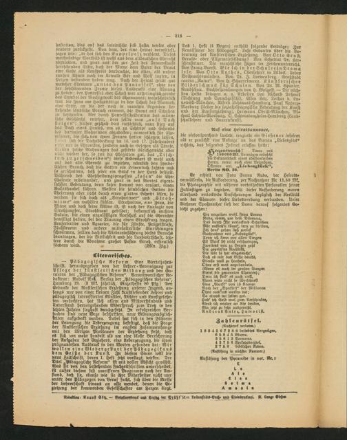 Das 1. Heft (4 Dogen) enthält folgende Beiträge, Zur Renaissance der Pädagogik. Loft Gedanken über die Bedeutung der künstlerischen Erziehung. Von Otto Ernst. Berufs- oder Allgemeinbildung? Von Schulrat Dr. Ker- schensteiner. Die menschliche Figur im Zeichenunterricht. Von Franz Breest. Wie ich in derSchuleeinDrama lese. Von Otto Anthes, Oberlehrer in Lübeck. Ueber Weihnachtsmärchen. Von Dr. I. Loewenberg. Großstadt contra „Natur". Von H. Scharrelmann. Künstlerischer Bilderschmuck für Schulen. Von Dr. M. Spanier. Rundschau. Buchbesprechungen von H. Wolgast. — Die nächsten Hefte bringen u. a. Arbeiten von Richard Dehmel (Dichtung und Sprachgefühl), Ellen Key, Lothar v. Kunowski-München, Alfred Lichtwark-Hamburg, Paul Natorp- Marburg (Ueber die sozialpädagogische Bedeutung der Kunst und der Kunsterziehung), Hermann Obrist-München, Michael Schiele-Marburg, O. Schwindrazheim-Hamburg (Landschullehrer und Bauernkunst).