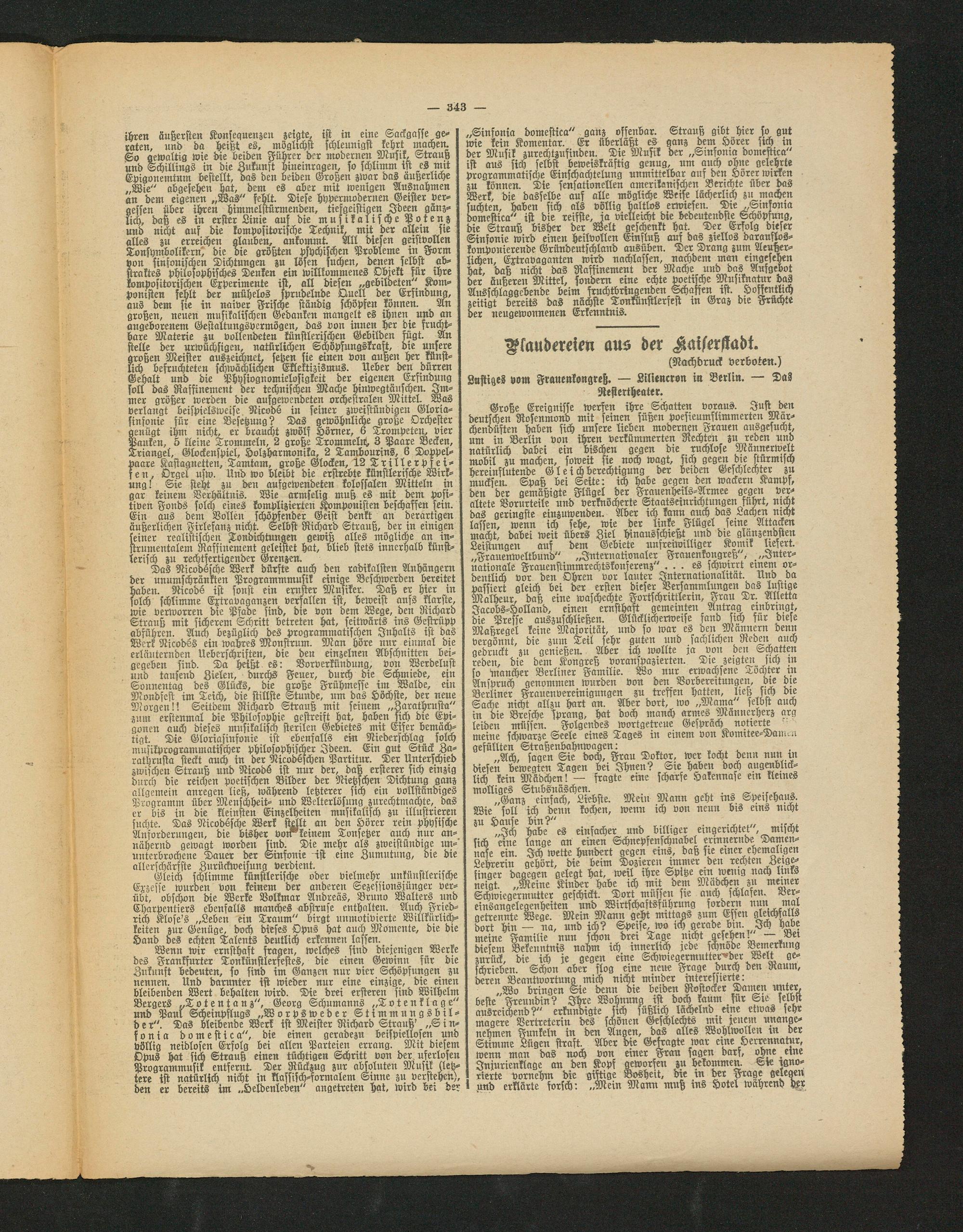 „Sinfonia domestica" ganz offenbar. Strauß gibt hier so gut wie kein Komentar. Er überläßt es ganz dem Hörer sich in der Musik zurechtzufinden. Die Musik der „Sinfonia domestica" ist aus sich selbst beweiskräftig genug, um auch ohne gelehrte programmatische Einschachtelung unmittelbar auf den Hörer wirken zu können. Die sensationellen amerikanischen Berichte über das Werk, die dasselbe auf alle mögliche Weffe lächerlich zu machen suchten, haben sich als völlig haltlos erwiesen. Die „Sinfonia domestica" ist die reifste, ja vielleicht die bedeutendste Schöpfung, die Strauß bisher der Welt geschenkt hat. Der Erfolg dieser Sinfonie wird einen heilvollen Einfluß auf das ziellos daraufloskomponierende Gründeutschland ausüben. Der Drang zum Aeußer- lichen, Extravaganten wird nachlassen, nachdem man eingesehen hat, daß nicht das Raffinement der Mache und das Aufgebot der äußeret: Mittel, sondern eine echte poetische Musiknatur das Ausschlaggebende beim fruchtbringenden Schaffen ist. Hoffentlich zeitigt bereits das nächste Tonkunstlerfest in Graz bte Früchte der neugewonnenen Erkenntnis.