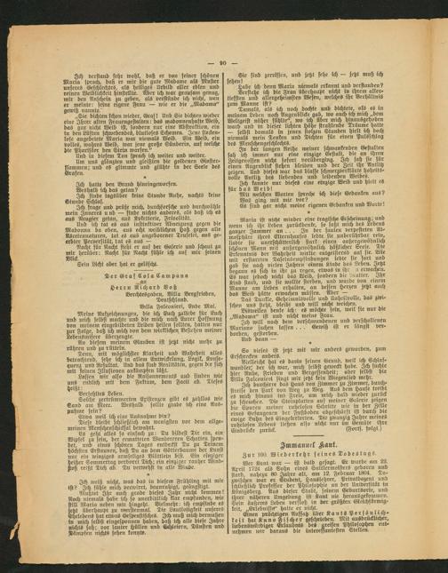 Ich durchirre das Haus von Zimmer zu Zimmer, durchs streife den Park von Weg zu Weg. Aus dem Hause treibt es mich hinaus ins Freie, um mich bald wieder zuruck zu scheuchen. Die Steinplatten auf meiner Galerie zeigen die Spuren meiner ruhelosen Schritte wie in der Zelle eines Gefangenen der Fußboden abgeschürft ist durchs die ewige Bahn des Eingekerkerten. Die zwanzig Jahre meines ruhelosen Lebens ließen also nicht nur lm Gemütc ihre Eindrücke zurück. (Forts, folgt.)