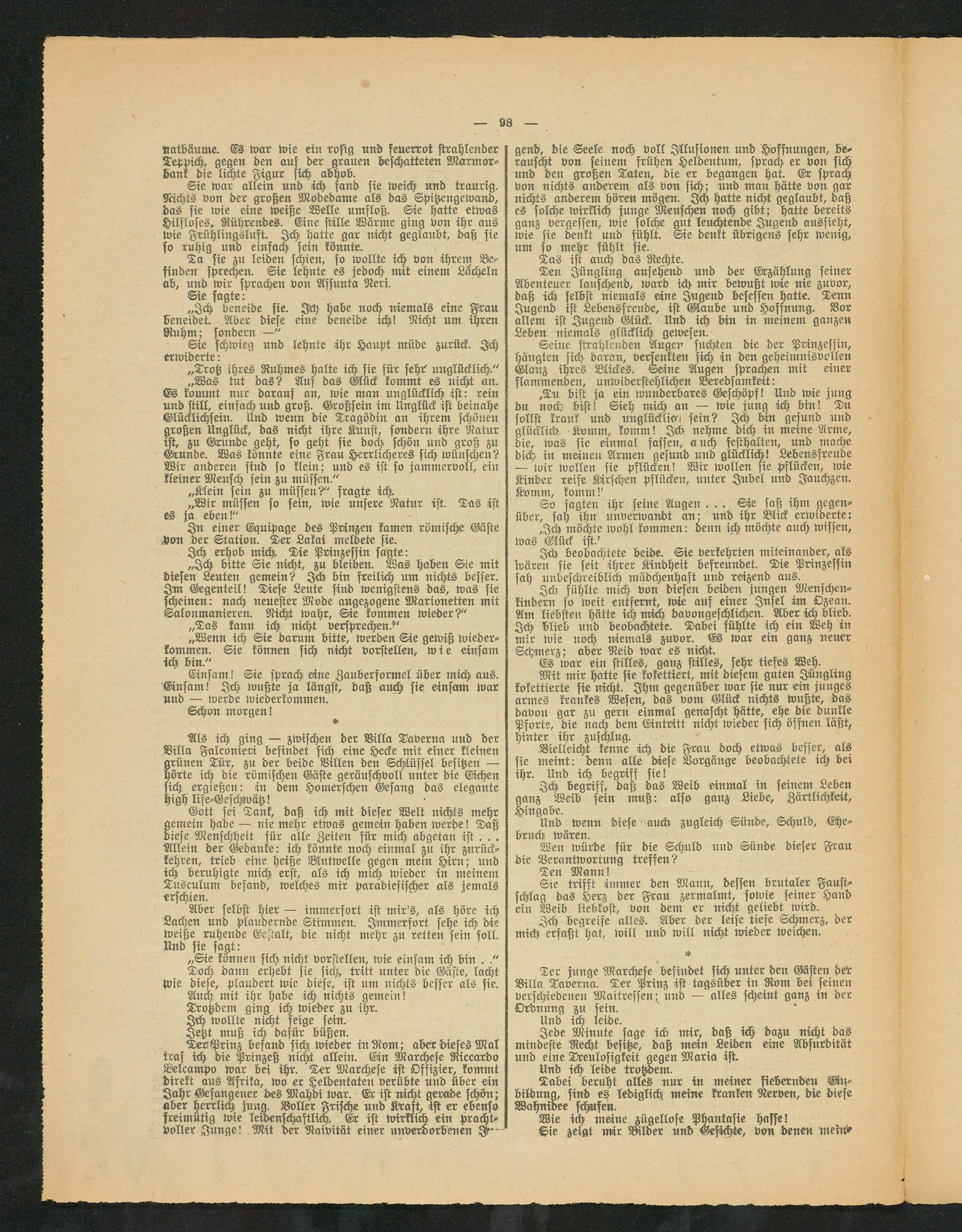 Ter Prinz befand sich wieder in Rom; aber'dieses Mal traf ich die Prinzeß nicht allein. Ein Marchese Riccardo Belcampo war bei ihr. Ter Marchese ist Offizier, kommt direkt aus Asiika, wo er Heldentaten verübte und über ein Zahr Gefangener des Mahdi war. Er ist nicht gerade schön; aber herrlich jung. Voller Frische und Kraft, ist er ebenfo freimütig wie leidenschaftlich. Er ist ivirklich ein prachtvoller Zunge! Mit der Naivität einer unverdorbenen $•-