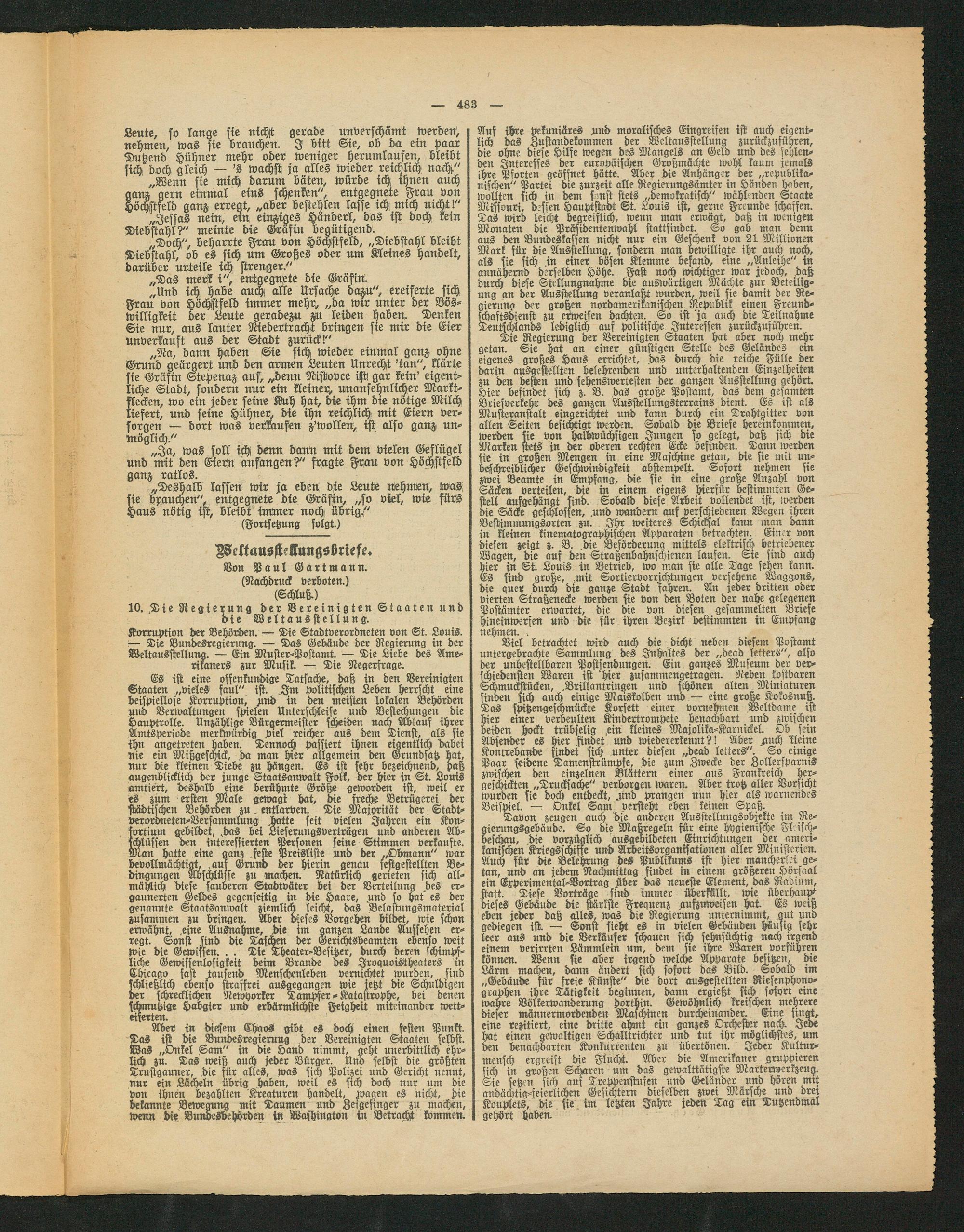 Korruption der Behörden. — Die Stadtverordneten von St. Louis. — Die Bundesregierung. — Das Gebäude der Regierung in der Weltausstellung. — Ein Muster-Postamt. — Die Liebe des Amerikaners zur Musik. — Die Negerfrage.