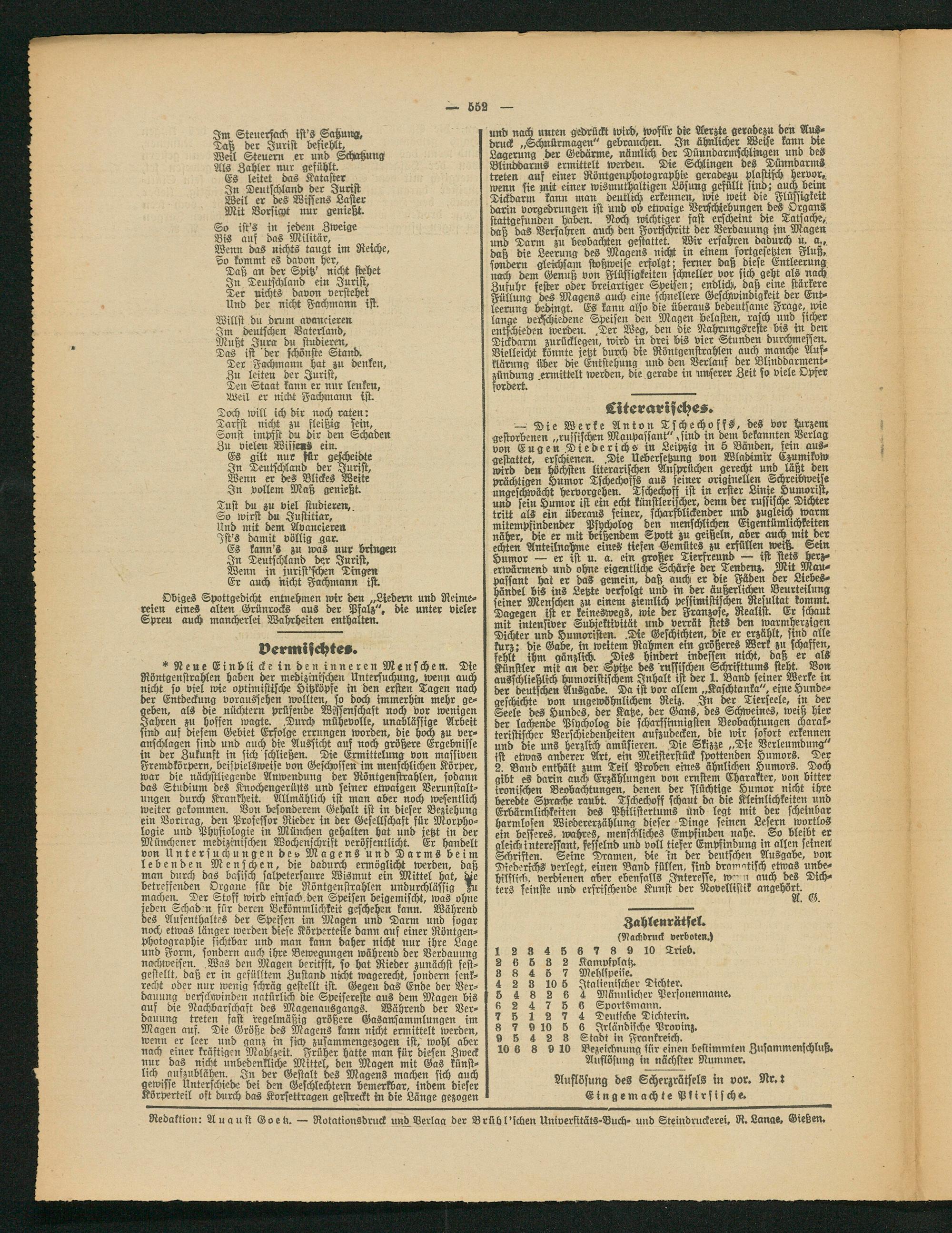 Redaktion: Auaust (BoeU. — Rotationsdruck und Verlaa der Brübl'schen Universttäts-Buch- und Steindruckerei, R.Lange, Gießen.