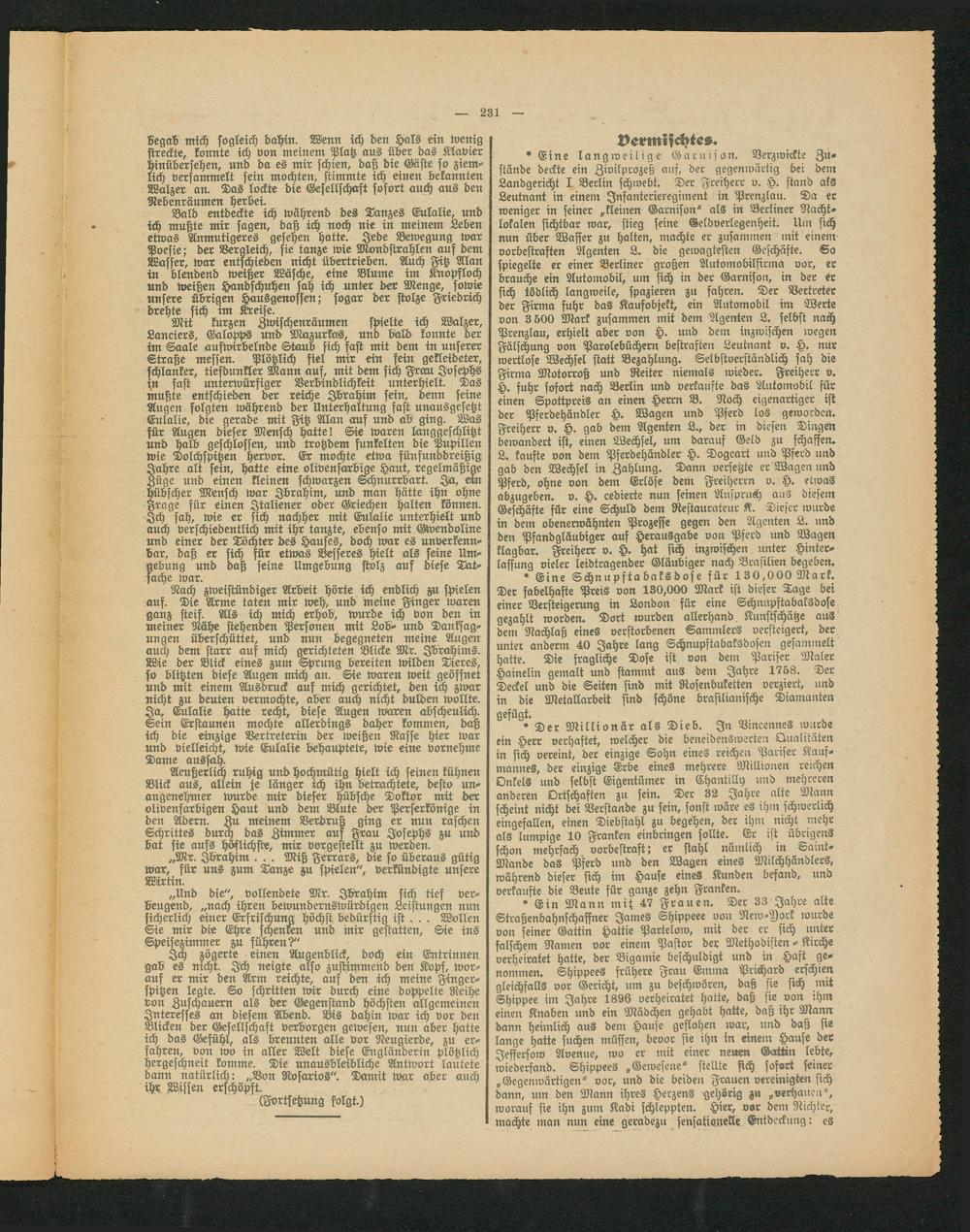 • Der Millionär als Dieb. In Vincennes wurde ein Herr verhaftet, welcher die beneidenswerten Qualitäten in sich vereint, der einzige Sohn eines reichen Pariser Kaufmannes, der einzige Erbe eines mehrere Millionen reichen Onkels und selbst Eigentümer in Chantilly und mehreren anderen Ortschaften zu sein. Der 32 Jahre alte Mann scheint nicht bei Verstände zu sein, sonst wäre es ihm schwerlich eingefallen, einen Diebstahl zu begehen, der ihm nicht mehr als lumpige 10 Franken einbringen sollte. Ec ist übrigens schon mehrfach vorbestraft; er stahl nämlich in Saint- Mande das Pferd und den Wagen eines Milchhändlers, während dieser sich im Hause eines Kunden befand, und verkaufte die Beute für ganze zehn Franken.