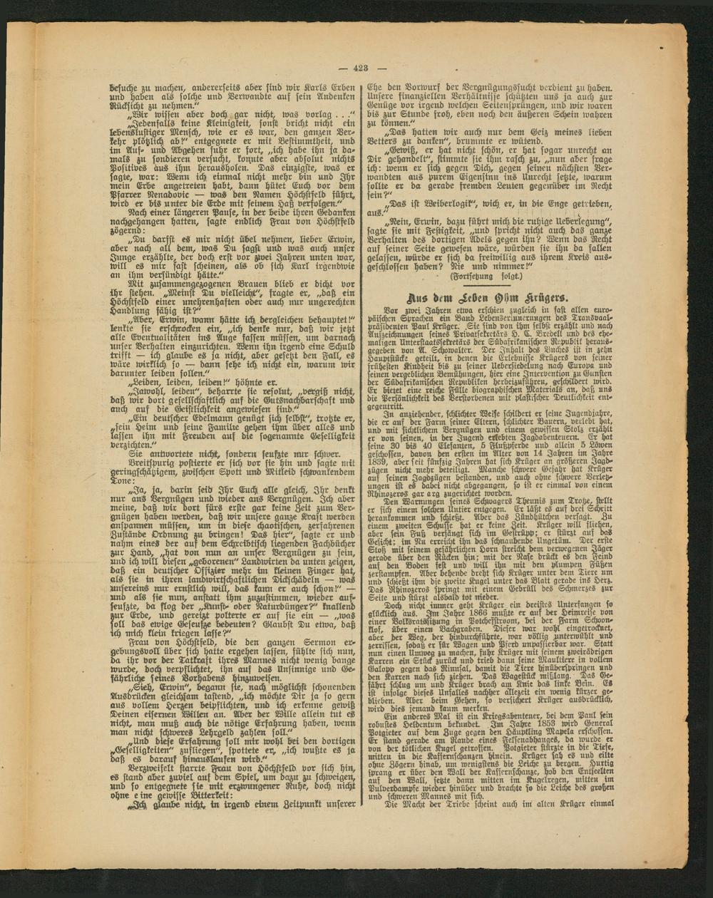 Vor zwei Jahren etwa erschien zugleich in fast allen europäischen Sprachen ein Band Lebenserinnerungen des Transvaal- Präsidenten Paul Krüger. .Sie sind von ihm selbst erzählt und nach Aufzeichnungen seines Privatsekrctärs H. C. Bredell und des ehemaligen Unterstaatssekretärs der Südafrikanischen Republik herausgegeben von A. Schowalter. Der Inhalt des Buches ist in zehn Hauptstück: geteilt, in denen die Erlebnisse Krügers von seiner frühesten Kindheit bis zu seiner Uebersiedelung nach Europa und seinen vergeblichen Bemühungen, hier eine Intervention zu Gunsten der Südafrikanischen Republiken herbeizuführen, geschildert wird. Er bietet eine reiche Fülle biographischen Materials an, daß uns die Persönlichkeit des Verstorbenen mit plastischer Deutlichkeit entgegentritt.