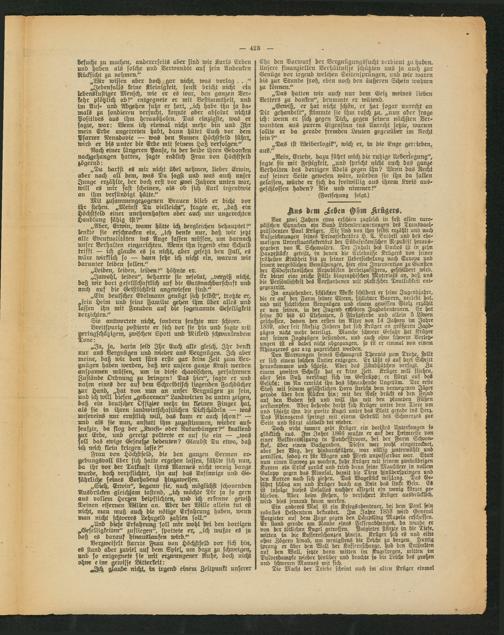 Ein anderes Mal ist ein Kriegs abenteuer, bei dem Paul sein robustes Heldentum bekundet. Im Jahre 1853 wird General Potgieter auf dem Zuge gegen den Häuptling Mapela erschossen. Er stand gerade am Rande eines Felsenabhanges, da wurde er von der tätlichen Kugel getroffen. Potgieter stürzte in die Tiefe, mitten in die Kaffernschanzen hinein. Krüger sah es und eilte ohne Zögern hinab, um wenigstens die Leiche zu bergen. Hurtig sprang er über den Wall der Kaffernschanze, hob den Entseelten auf den Wall, setzte dann mitten im Kugelregen, mitten im Pulverdampfe tvieder hinüber und brachte so die Leiche des großen und schweren Mannes mit sich.