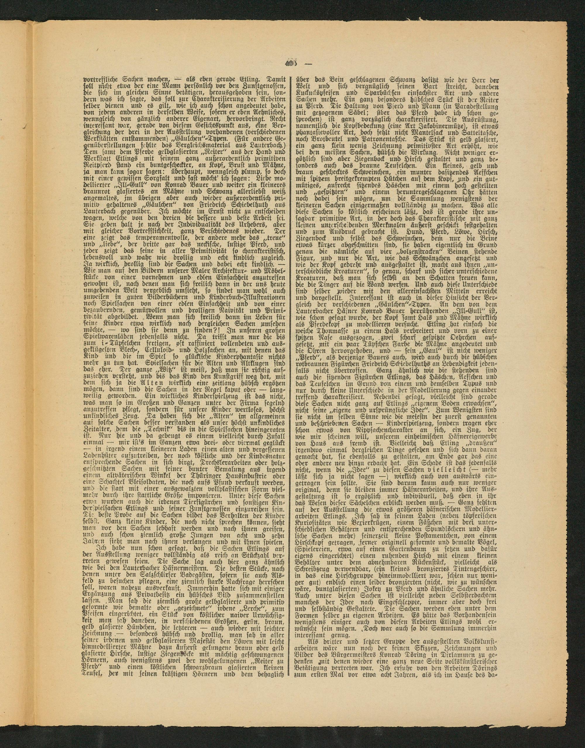 vortreffliche Sachen machen, — als eben gerade Etling. Damit soll nicht etivfl der eine Mann persönlich vor den Zunstgenossen, die sich im gleichen Sinne betätigen, herausgehoben sein, sondern was ich sagte, das soll zur Charakterisierung der Arbeiten selber dienen und es gilt, wie ich auch schon angedeutet habe, von jedem anderen in derselben Weise, sofern er eben Aehnliches, wenngleich von gänzlich anderer Eigenart, hervorbringt. Recht interessant war, gerade von diesem Gesichtspunkt aus, eine Vergleichung .ber drei in der Ausstellung vorhandenen (verschiedenen Werkstätten entstammenden) „Gäulchen"-Typen. (Für andere Gegenüberstellungen fehlte das Vergleichsmaterial aus Lauterbach) Dem samt dem Pferde gelbglasierten „Reiter" aus der Hand und Werkstatt Etlings mit seinem ganz außerordentlich primitiven Reitpferd stand ein buntgescheckter, an Kopf, Brust und Mähne, ja man kann sogar sagen: überhaupt, wenngleich plump, so doch mit einer gewissen Sorgfalt und fast möcht'ich sagen: Liebe modellierter „Jll-Gull" von Konrad Bauer und weiter xin kleineres braunrot glasiertes an Mähne und Schwanz allerliebst weiß angemaltes, jm übrigen aber auch wieder außerordentlich primitiv gehaltenes „Gäulchen" von Friedrich Schiebelhuth aus Lauterbach gegenüber. Ich möchte im Ernst nicht zu entscheiden wagen, welche von den dreien die bessere und beste Arbeit sei. Sie geben halt je nach der Individualität des Urhebers, aber mit gleicher Vortrefslichkeit, ganz Verschiedenes wieder. Ter eine zeigt das temperamentvolle, her andere mehr das „treue" und „liebe", der dritte gar das neckische, lustige Pferd, und jeder zeigt das seine in aller Primitivität so charakteristisch, lebensvoll und wahr wie drollig und echt kindlich zugleich. Ja wirklich, drollig sind die Sachen und dabei echt kindlich. — Wie man auf den Bildern unserer Maler Architektur- und Möbelstücke von einer vornehmen und edlen Einfachheit anzutreffen gewohnt ist, nach denen man sich freilich dann in der uns heute umgebenden Welt vergeblich umsieht, so findet man wohl auch zuweilen in guten Bilderbüchern und Kinderbuch-Illustrationen noch Spielsachen von einer edlen Einfachheit und von einer bezaubernden, gemütvollen und drolligen Naivität und Primitivität abgebildet. , Wenn man sich freilich dann im Leben für seine Kinder etwa wirklich nach dergleichen Sachen umsehen möchte, — wo sind sie denn zu finden?! In unseren großen Spielwarenläden jedenfalls nicht. Da trifft man nur die bis zum i-Tüpfelchen fertigen, ost raffiniert vollendeten und ausgeklügelten Blech-, Celluloid- und Holzsachen an, mit denen das Kind und die im Spiel so glückliche Kinderphantasie nichts mehr zu tun hat. Spielsachen sür die Alten und Altklugen sind das eher. Ter ganze „Witz" ist meist, haß man sie richtig aufzuziehen versteht, und bis das Kind den Kunstgriff weg hat, mit dem sich ja die Alten wirklich eine zeitlang hübsch ergötzen mögen, dann sind die Sachen in der Regel kaput oder — langweilig geworden. Ein wirkliches Kinderspielzeug ist das nicht, was man so im Großen und Ganzen unter der Firma segelnd anzutreffen pflegt, sondern sür unsere Kinder wertloses, höchst unkindliches Zeug. ,Ta haben sich die „Alten" im allgemeinen auf solche Sachen besser verstanden als unser höchst unkindliches Zeitalter, dem die „Technik" bis in die Spielsachen hineingeraten ist. Nur hie und da gebeugt es einem vielleicht durch Zufall einmal — mir ist's im Ganzen etwa drei- oder viermal geglückt — in irgend einem kleineren Laden einen alten und vergessenen Ladenhüter aufzutreiben, der nock köstliche und der Kindcsnatur entsprechende Sachen in sich birgt, Drechslerarbeiten oder hvlz- geschnitzten Sachen mit feiner bunter Bemalung aus irgeiid einens altväterischen Winkel der Thüringer Hausindustrie oder eine Schachtel Bleisoldaten, die noch aufs Pfund verkauft werden, und die statt mit einer ausgewalzten vollplastischen Form vielmehr durch ihre stattliche Größe imponieren. Unter diese Sachen etwa. wurden auch die irdenen Tierfigürchen und sonstigen Kinder pielsachen Etlings und seiner Zunstgenossen einzureihen sein. Tie^ beste Probe auf die Sachen bildet das Verhalten der Kinder selbst. Ganz kleine Kinder, die noch nicht sprechen können, sieht man vor den Sachen lebhaft werden und nach ihnen greifen, und auch schon ziemlich große Jungen von acht und zehn Jahren sieht man nach ihnen verlangen und mit ihnen spielen.