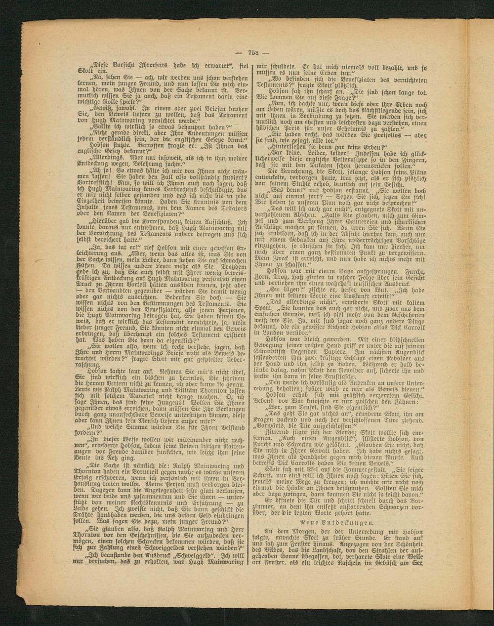 „Ah so! So etwas hätte ich mir von Ihnen nicht träumen lassen! Sie haben den Fall also vollständig studiert? Vortrefflich! Nun, so will ich Ihnen auch noch sagen, daß ich Hugh Mainwaring keines Verbrechens beschuldigte, das er mir nicht selber gestanden und das ich nicht bis in jede Einzelheit beweisen könnte. Haben Sie Kenntnis von dem Inhalte jenes Testaments, von dem Namen des Testators oder den Namen der Benefiziaten?"