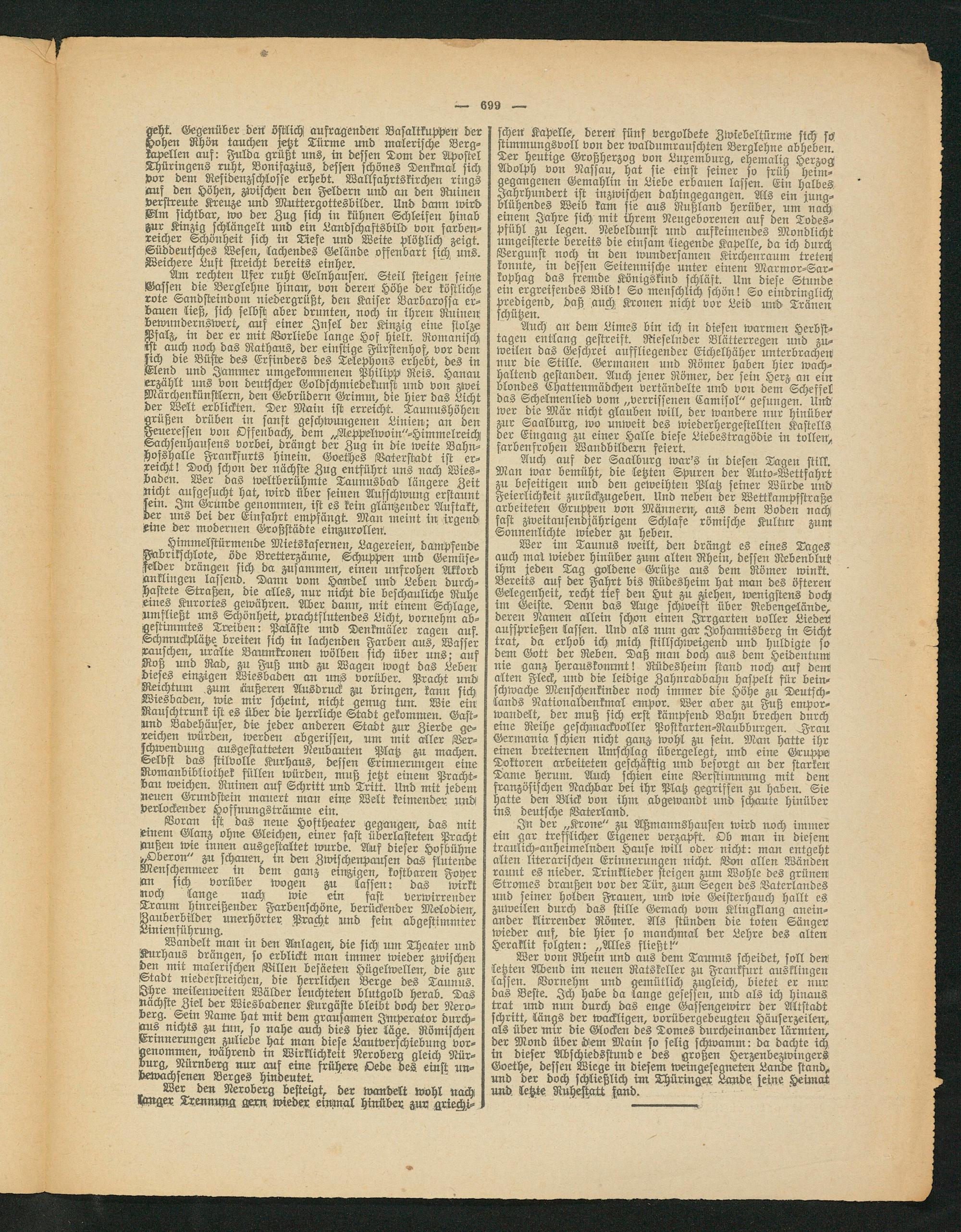 Wer vom Rhein und aus dem Taunus scheidet, soll den- letzten Abend im neuen Ratskeller zu Frankfurt ausklingen lassen. Vornehm und gemütlich zugleich, bietet er nur das Beste. Ich habe da lange gesessen, und als ich hinaus trat und nun durch das enge Gassengewirr der Altstadt schritt, längs der wackligen, vorübergebeugten Häuserzeilen, als über mir die Glocken des Tomes durcheinander lärmten, der Mond über d-em Main so selig schwamm: da dachte ich in dieser Abschiedsstund e des großen Herzenbezwingers Goethe, dessen Wiege in diesem weingesegneten Lande stand, und der doch schließlich tot Thüringer Lande feine Heimat und. letzte Ruhestatt sand.