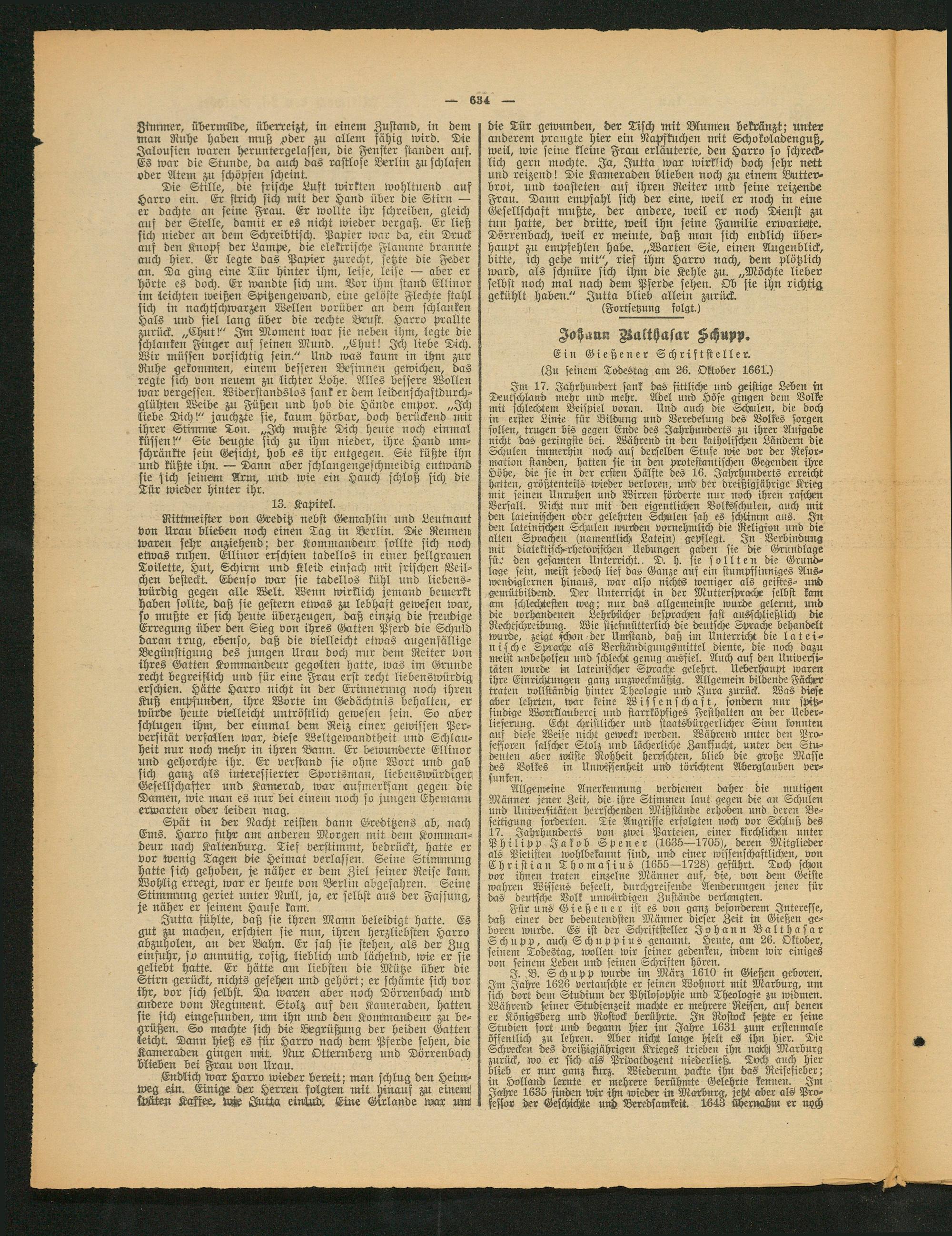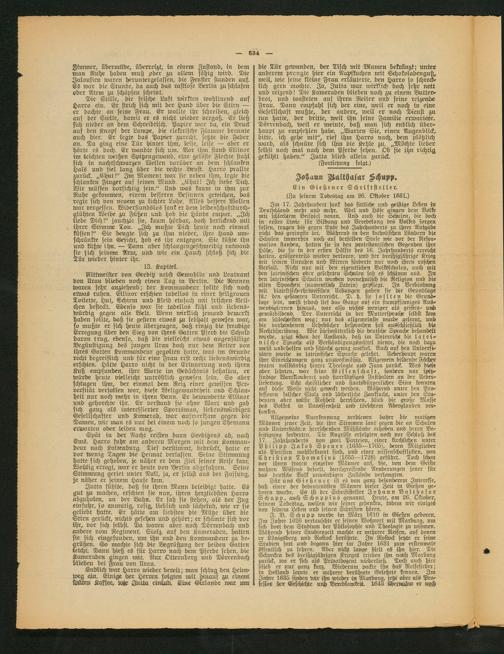 Für uns Gießener ist es von ganz besonderem Interesse, daß einer der bedeutendsten Männer dieser Zeit in Gießen geboren wurde. Es ist der Schriftsteller Johann Balthasar Schupp, auch Schuppius genannt. Heute, am 26. Oktober, seinem Todestag, wollen wir feiner gedenken, indem wir einiges von seinem Leben und seinen Schttften hören.