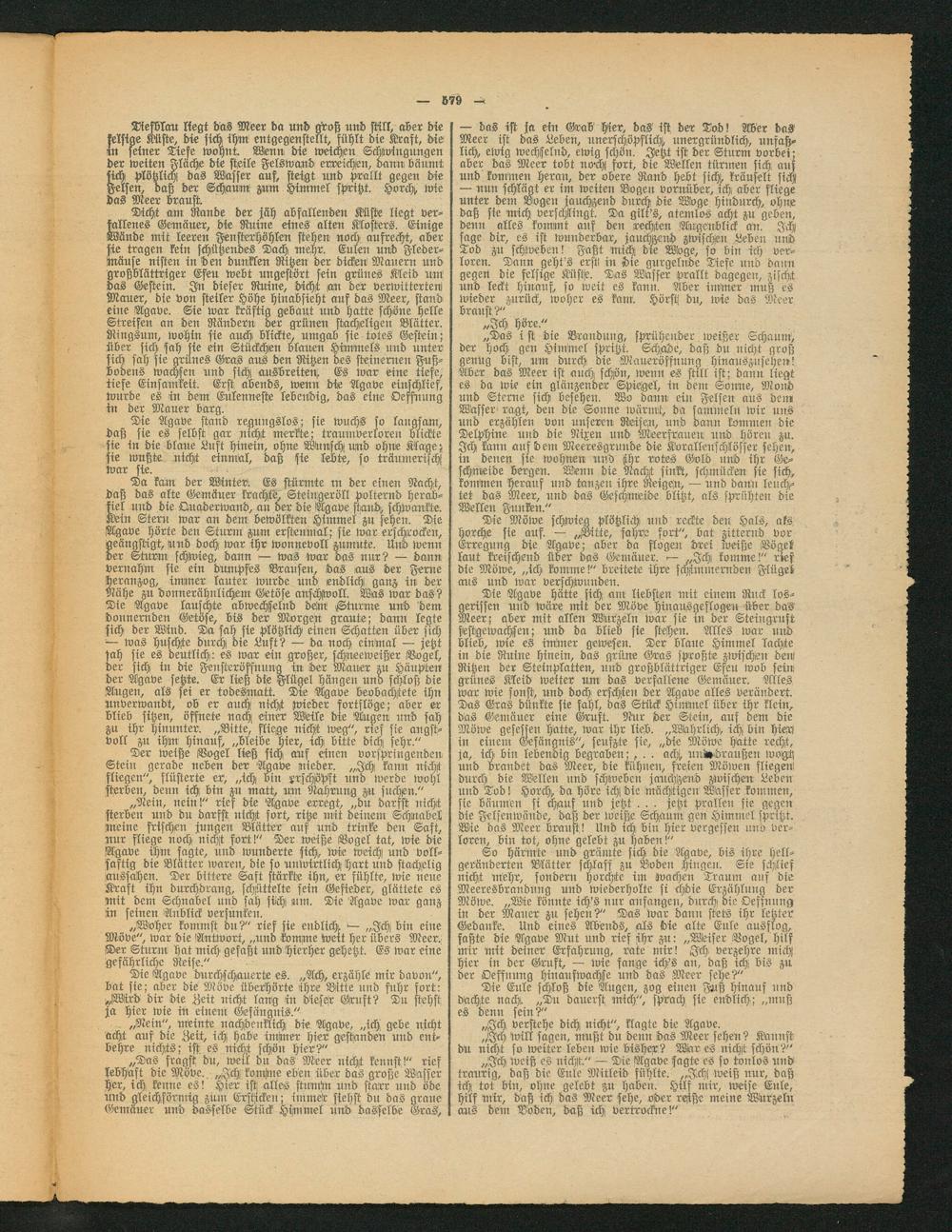 So härmte und grämte sich bte Agave, bis ihre yell- geränderten Blätter schlaff zu Boden Hingen. Sie schlief nicht mehr, sondern horchte im Wachen Traum ans die Meeresbrandnug und wiederholte si chdie Erzählung der Möwe. „Wie könnte ich's nur ansangen, durch die Oeffnung in der Maner zn sehen?" Das war dann stets ihr letzter Gedanke. Unb eines Abends, als die alte Eule ausflog, faßte die Agave Mut und rief ihr zu: „Wckiser Bogel, hilf mir mit deiner Erfahrung, rate mir! Ich verzehre mich hier in der Gruft, — wie fange ich's au, daß ich bis zu der Oeffnimg hiuauswachse und das Meer sehe?"