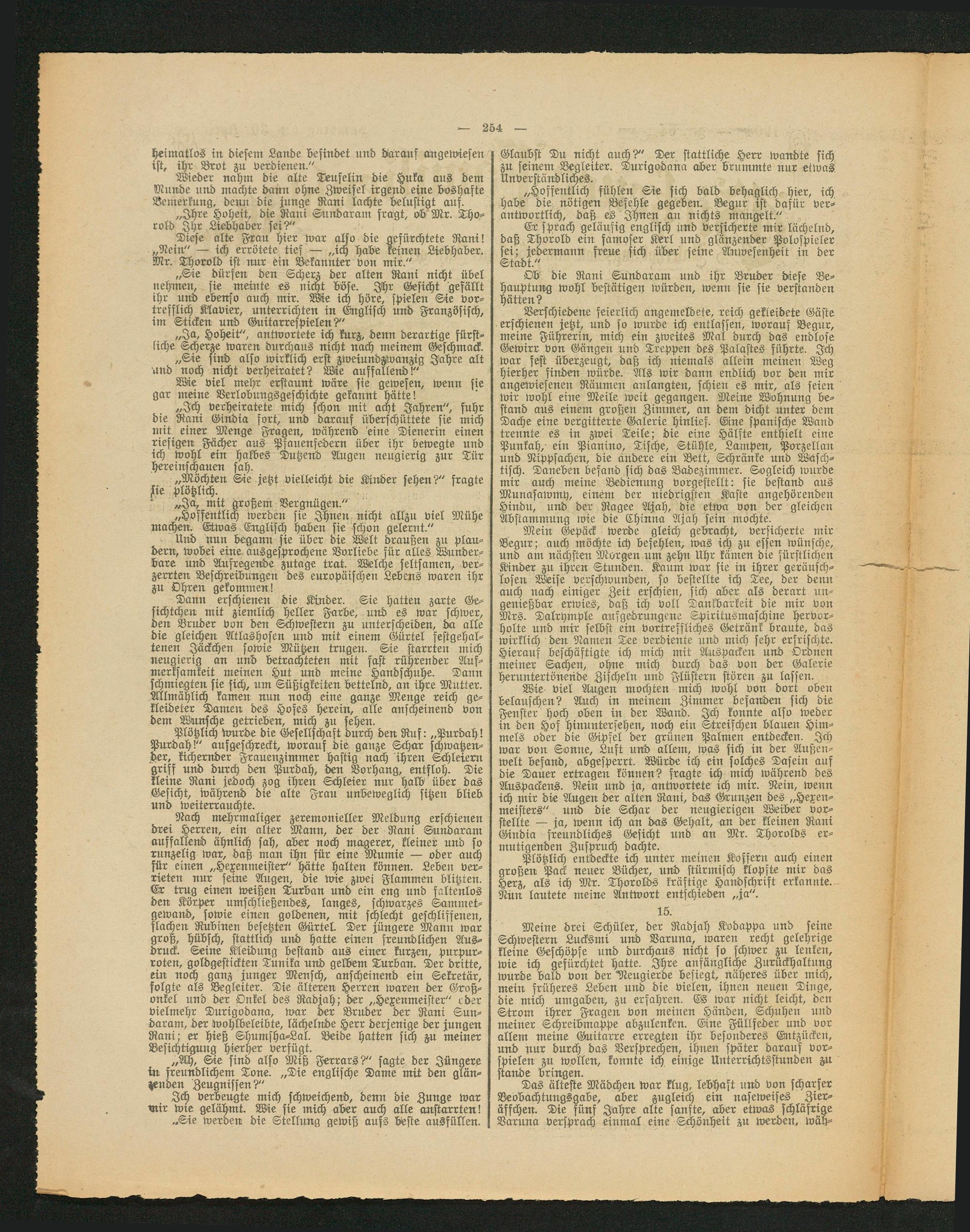 „Sie dürfen den Scherz der alten Rani nicht übel nehmen, sie meinte es nicht böse. Ihr Gesicht gefällt ihr und ebenso auch mir. Wie ich höre, spielen Sie vor- trefflich Klavier, unterrichten in Englisch und Französisch, im Sticken und (8-uitarrcspielen?"