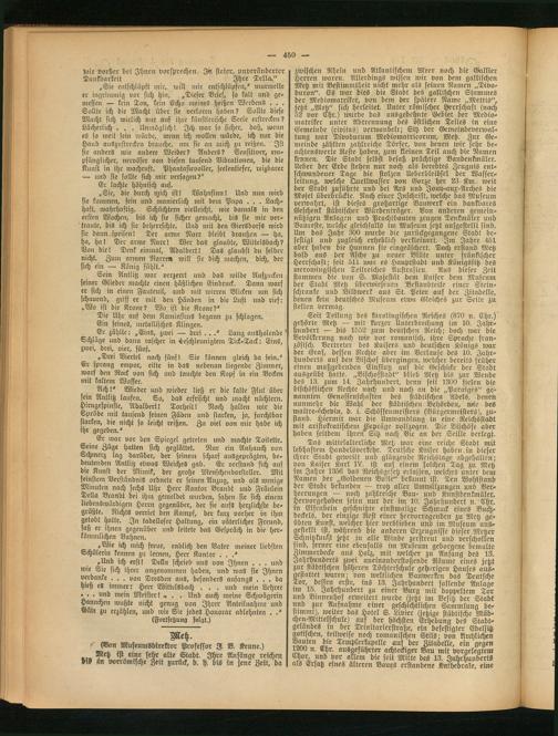 Das mittelalterliche Metz war eine reiche Stadt mit lebhaftem Handelsverkehr. Deutsche Kaiser haben.in dieser ihrer Stadt geweilt und glanzende Reichstage abgehalten; von Kaiser Karl IV. ist auf einem solchen Tag zu Metz im Jahre 1356 das Reichsgesetz erlassen, welches unter dem Namen der „Goldenen Bulle" bekannt ist. Ten Wohlstand der Stadt bekunden — trotz aller Umwälzungen und Verheerungen — noch zahlreiche Bau- und Kunstdenkmäler. Hervorgehoben seien nur der im 10. Jahrhundert n. Chr. in Elfenbein geschnitzte einstmalige Schmuck eines Buch? deckels, der einzige Rest einer hervorragenden zu Metz geübten Kunst, welcher hier verblieben und im Museum ausgestellt ist, während die anderen Erzeugnisse dieser Metzer Schnitzkunlst jetzt in alle Winde zerstreut und verschollen sind, ferner eine ebenfalls im Museum geborgene bemalte Zimmerdecke aus Holz, mit welcher zu Anfang des 13. Jahrhunderts zwei aneinanderstoßende Räume eines jetzt zur städtischen höheren Töchterschule gehörigen Hauses ausgestattet waren; von weltlichen Bauwerken das Deutsche Tor, dessen erste, ins 13. Jahrhundert fallende Anlage cm lo. Jahrhundert zu einer Burg mit doppeltem Tor und Binnenhof erweitert wurde (jetzt im Besitz der Stadt und zur Aufnahme einer geschichtlichen Sammlung bestimmt), weiter das Hotel S. Livier (jetzige städtische Mädchen-Mittelschule) auf der höchsten Erhebung des Stadtgeländes in der Trinitarierstraße, ein befestigter Edelsitz gotischen, teilweise noch romanischen Stils; von kirchlichen dOAA^ett Templerkapelle auf der Zitadelle, ein gegen 1200 n. Chr. ausgeführter achteckiger Bau mit vorgelegtent Chor, und vor allem die seit Mitte des 13. Jahrhunderts am Ersatz eines älteren Banes erstandene Kathedrale, eine