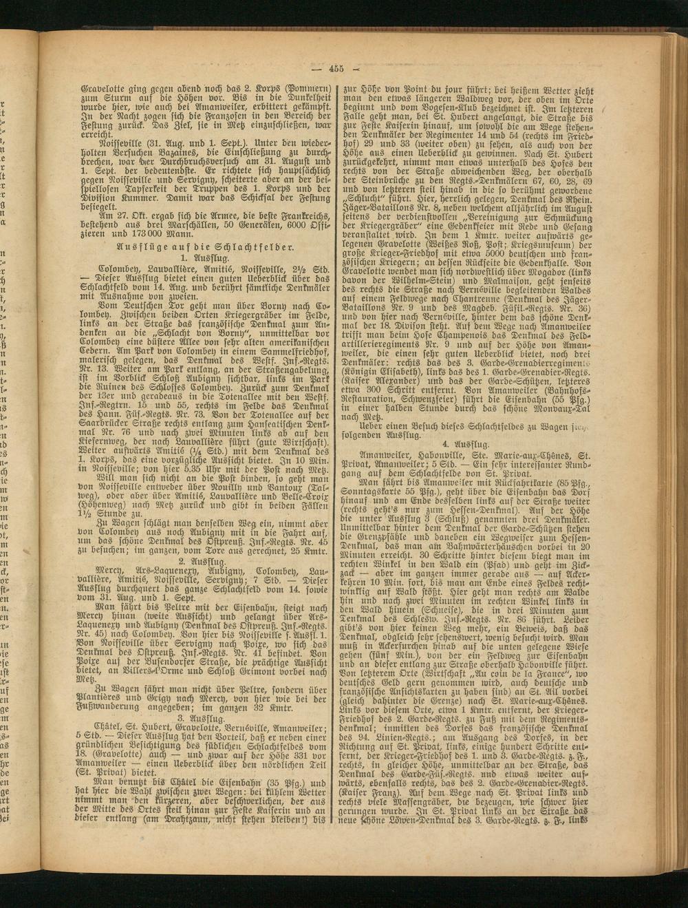 Chätel, St. Hubert, Gravelotte, Verusville, Amanweiler; 5 Std. — Dieser Ausflug hat den Vorteil, daß er neben einer gründlicher- Besichtigung des südlichen Schlachtfeldes vom 18. (Gravelotte) auch — und zwar auf der Höhe 331 vor Amanweiler — einen Ueberblick über den nördlichen Teil (St. Privat) bietet.