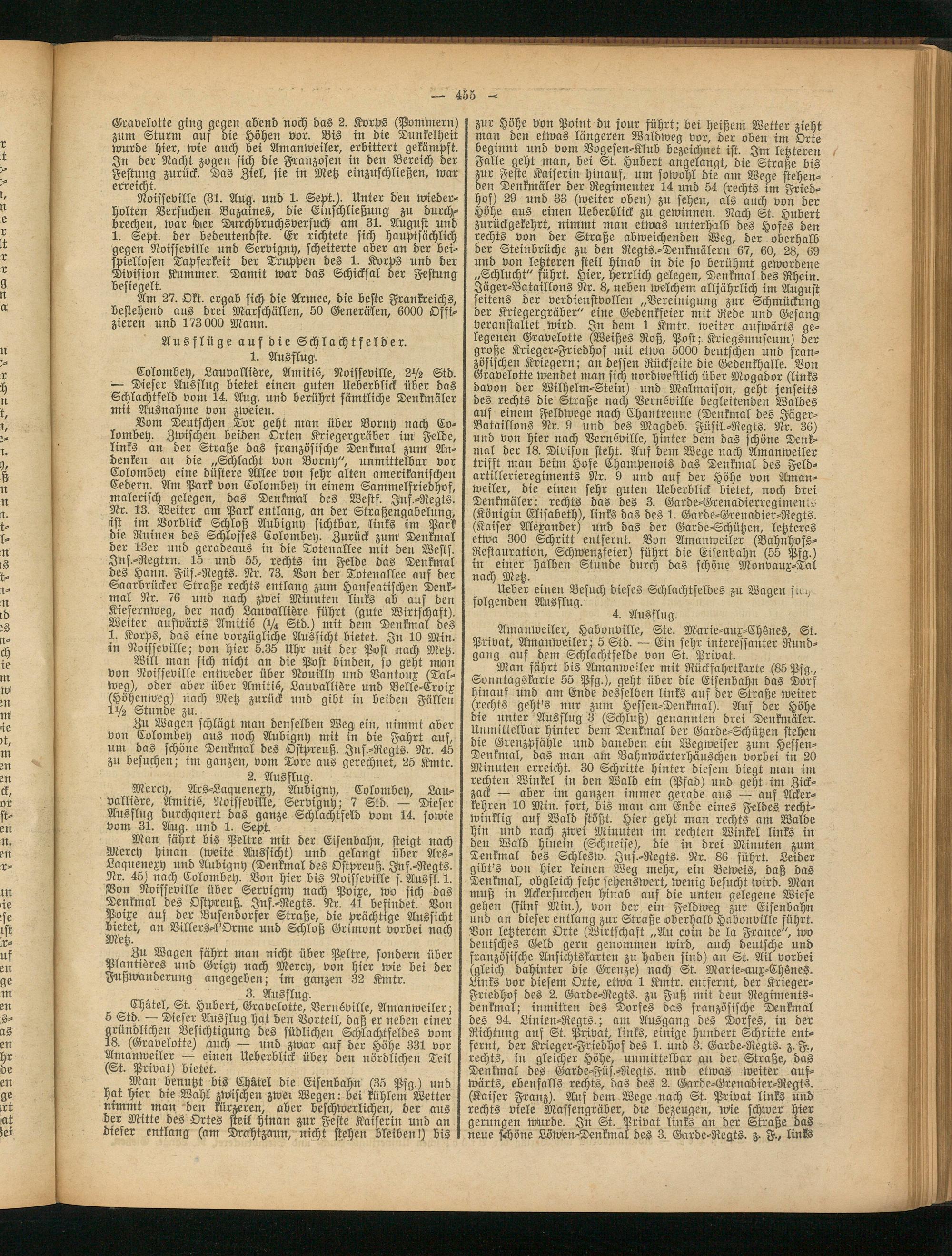 zur Höhe von Point du jour führt; bei heißem Wetter zieht man den etwas längeren Waldweg vor, der oben im Orte beginnt und vom Vogesen-Klub bezeichnet ist. Im letzteren Falle geht man, bei St. Hubert angelangt, die Straße bis zur Feste Kaiserin hinauf, um sowohl die am Wege stehenden Denkmäler der Regimenter 14 und 54 (rechts im Friedhof) 29 und 33 (weiter oben) zu sehen, als auch von der Höhe aus einen Ueberblick zu gewinnen. Nach St. Hubert zurückgekehrt, nimmt man etwas unterhalb des Hofes den rechts von der Straße abweichenden Weg, der oberhalb der Steinbrüche zu den Regts.-Denkmälern 67, 60, 28, 69 und von letzteren steil hinab in die so berühmt gewordene „Schlucht" führt. Hier, herrlich gelegen, Denkmal des Rhein. Jäger-Bataillons Nr. 8, neben welchem alljährlich im August seitens der verdienstvollen „Bereinigung zur Schmückung der Kriegergräber" eine Gedenkfeier mit Rede und Gesang veranstaltet wird. In dem 1 Kmtr. weiter aufwärts gelegenen Gravelotte (Weißes Roß, Post;. Kriegsmuseum) der große Krieger-Friedhof mit etwa 5000 deutschen und französischen Kriegern; an dessen Rückseite die Gedenkhalle. Bon Gravelotte wendet man sich nordwestlich über Mogador (links davon der Wilhelm-Stein) und Malmaison, geht jenseits des rechts die Straße nach Bernsville begleitenden Waldes auf einem Feldwege nach Chantrenne (Denkmal des Jäger- Bataillons Nr. 9 und des Magdeb. Füsil.-Regts. Nr. 36) und von hier nach Bernoville, hinter dem das schöne Denkmal der 18. Divison steht. Auf dem Wege nach Amanweiler trifft man beim Hofe Champenois das Denktnal des Feldartillerieregiments Nr. 9 und aus der Höhe von Amanweiler, die einen sehr guten Ueberblick bietet, noch drei Denkmäler: rechts das des 3. Garde-Grenadierregiments (Königin Elisabeth), links das des 1. Garde-Grenaüier-Regts. (Kaiser Alexander) und das der Garde-Schützen, letzteres etwa 300 Schritt entfernt. Bon Amanweiler (Bahnhofs- Restauration, Schwenzfeier) führt die Eisenbahn (55 Pfg.) in einer halben Stunde durch das schöue Monvaux-Tal nach Metz.