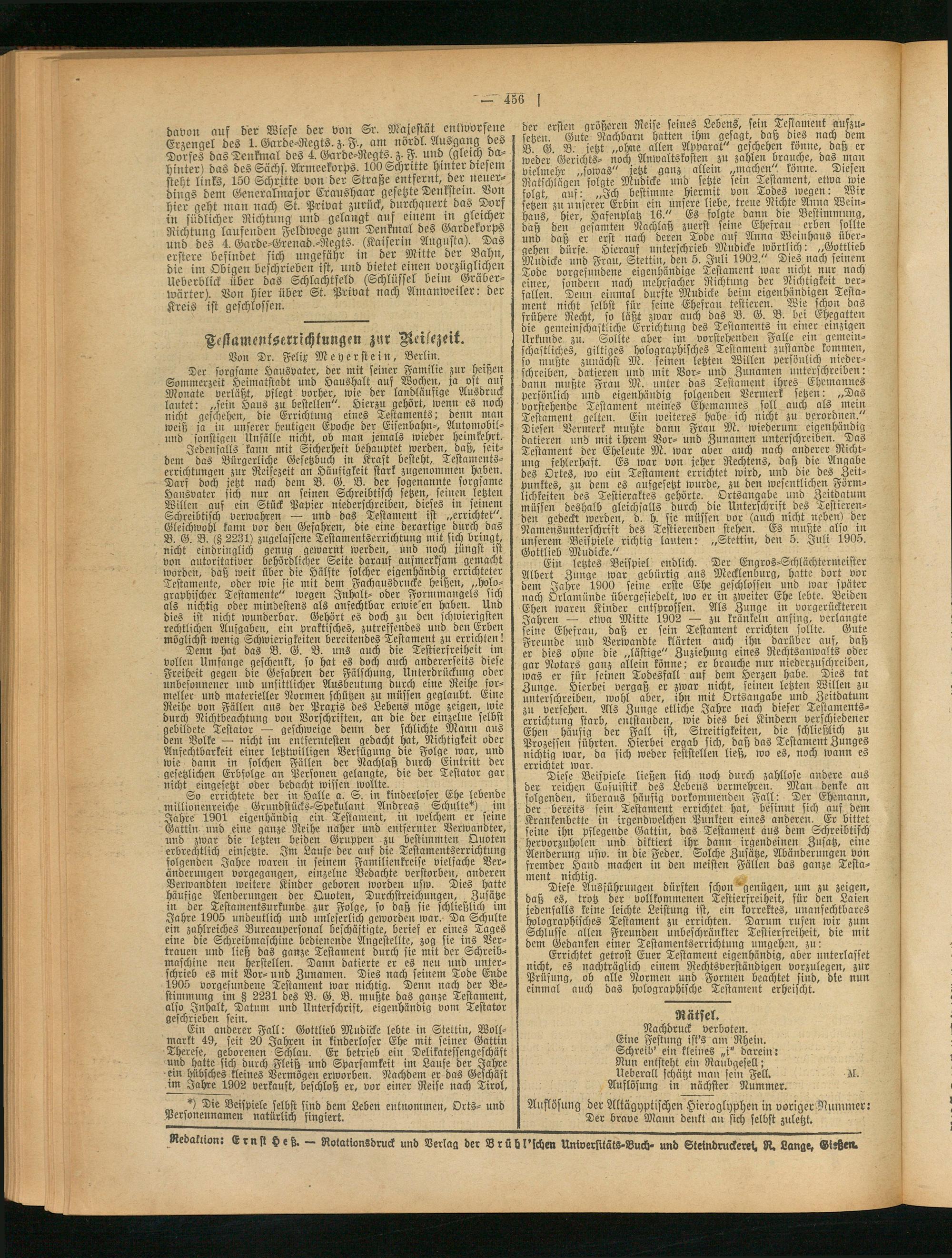 Der sorgsame Hausvater, der mit seiner Familie zur heißen Sommerzeit Heimatstadt und Haushalt auf Wochen, ja oft auf Monate verläßt, pflegt vorher, wie der landläufige Ausdruck lautet: „sein Haus zu bestellen". Hierzu gehört, wenn es noch nicht geschehen, die Errichtung eines Testaments: denn man weiß ja in unserer heutigen Epoche der Eisenbahn-, Automobil- und sonstigen Unfälle nicht, ob mau jemals wieder heimkehrt.