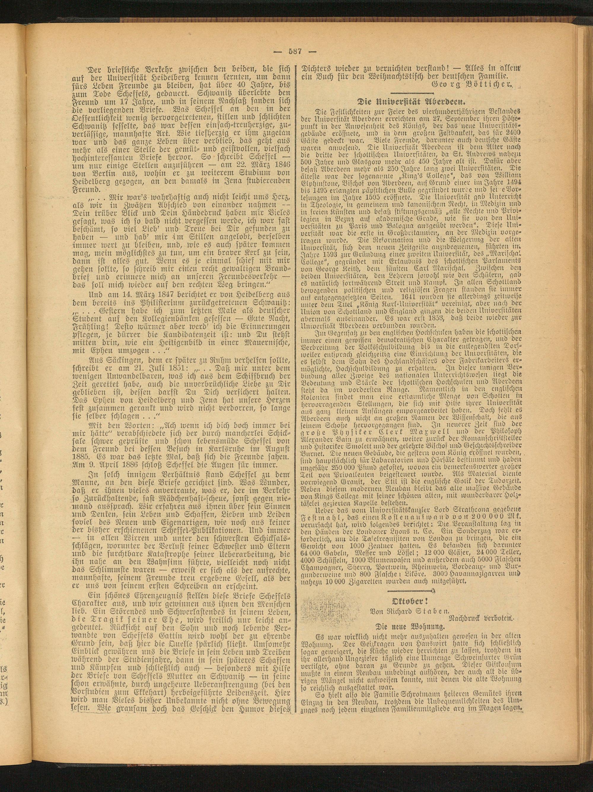 In solch innigem Verhältnis stand Scheffel zu dem Männe, an den diese Briefe gerichtet sind. Was Wunder, daß er ihnen vieles anvertraute, was er, der im Verkehr so Zurückhaltende, fast Mädchenhaft-scheue, sonst gegen niemand aussprach. Wir erfahren aus ihnen über sein Sinnen und Denken, sein Leben und Schaffen, Lieben und Leiden soviel des Neuen und Eigenartigen, wie noch aus keiner der bisher erschienenen Scheffel-Publikationen. Und immer — in allen Wirren und unter den schwersten Schicksalsschlägen, worunter der Verlust seiner Schwester und Eltern und die furchtbare Katastrophe seiner Ueberarbeitung, die ihn nahe an den Wahnsinn führte, vielleicht noch nicht das Schlimmste waren — erweist er sich als der aufrechte, mannhafte, seinem Freunde treu ergebene Gesell, als der er uns von seinem ersten Schreiben an erscheint.