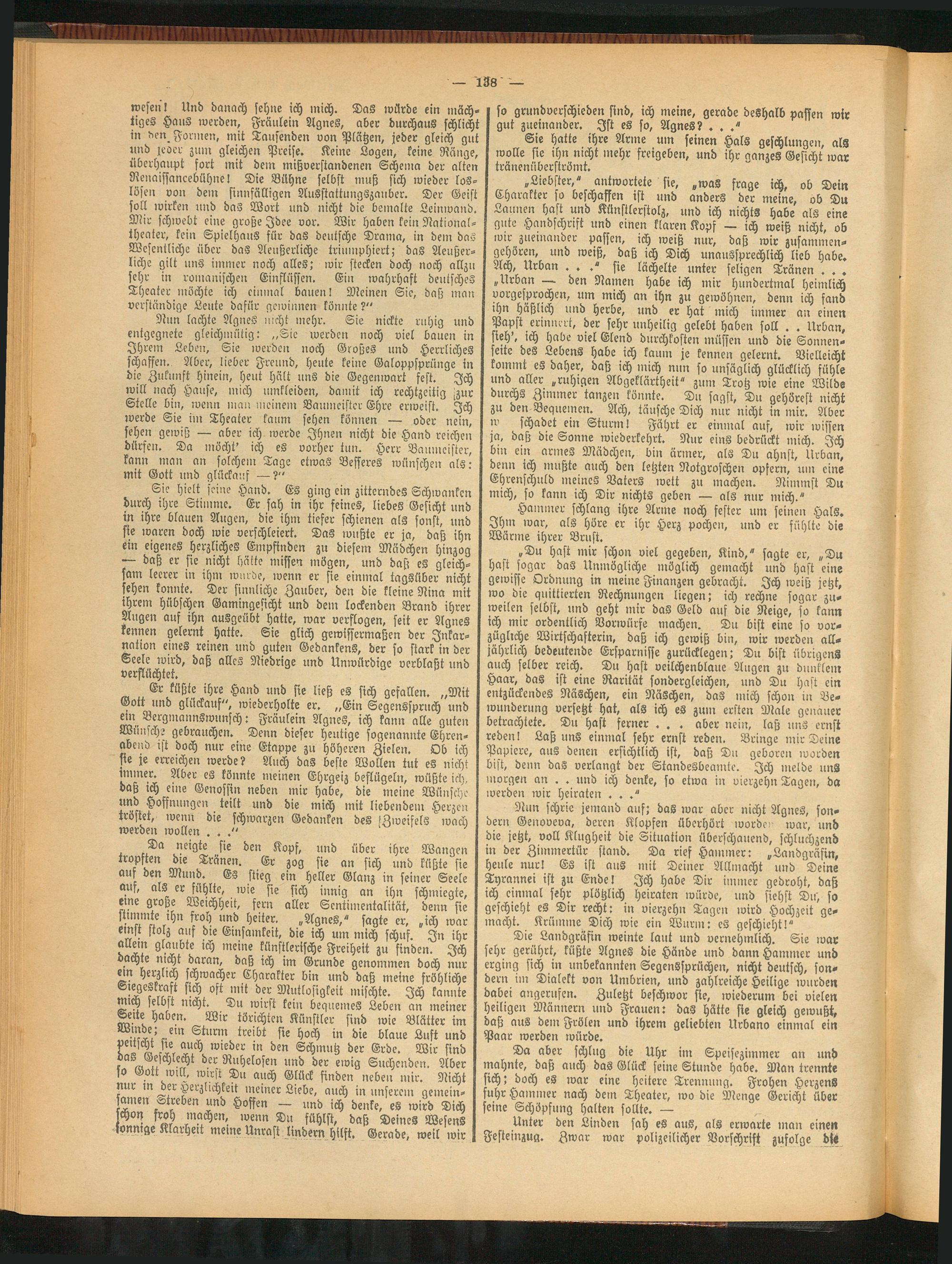 Die Landgräsin weinte laut und vernehmlich. Sie war sehr gerührt, küßte Agnes die Hände und dann Hammer und erging sich in unbekannten Segenssprüchen, nicht deutsch, son- dem im Dialekt von Umbrien, und zahlreiche Heilige ivurden dabei angerufen. Zuletzt beschwor sie, wiederum bei vielen heiligen Männern und Frauen: bas hätte sie gleich gewußt, baß aus bem Fristen und ihrem geliebten Urbano einmal ein Paar werben würde.