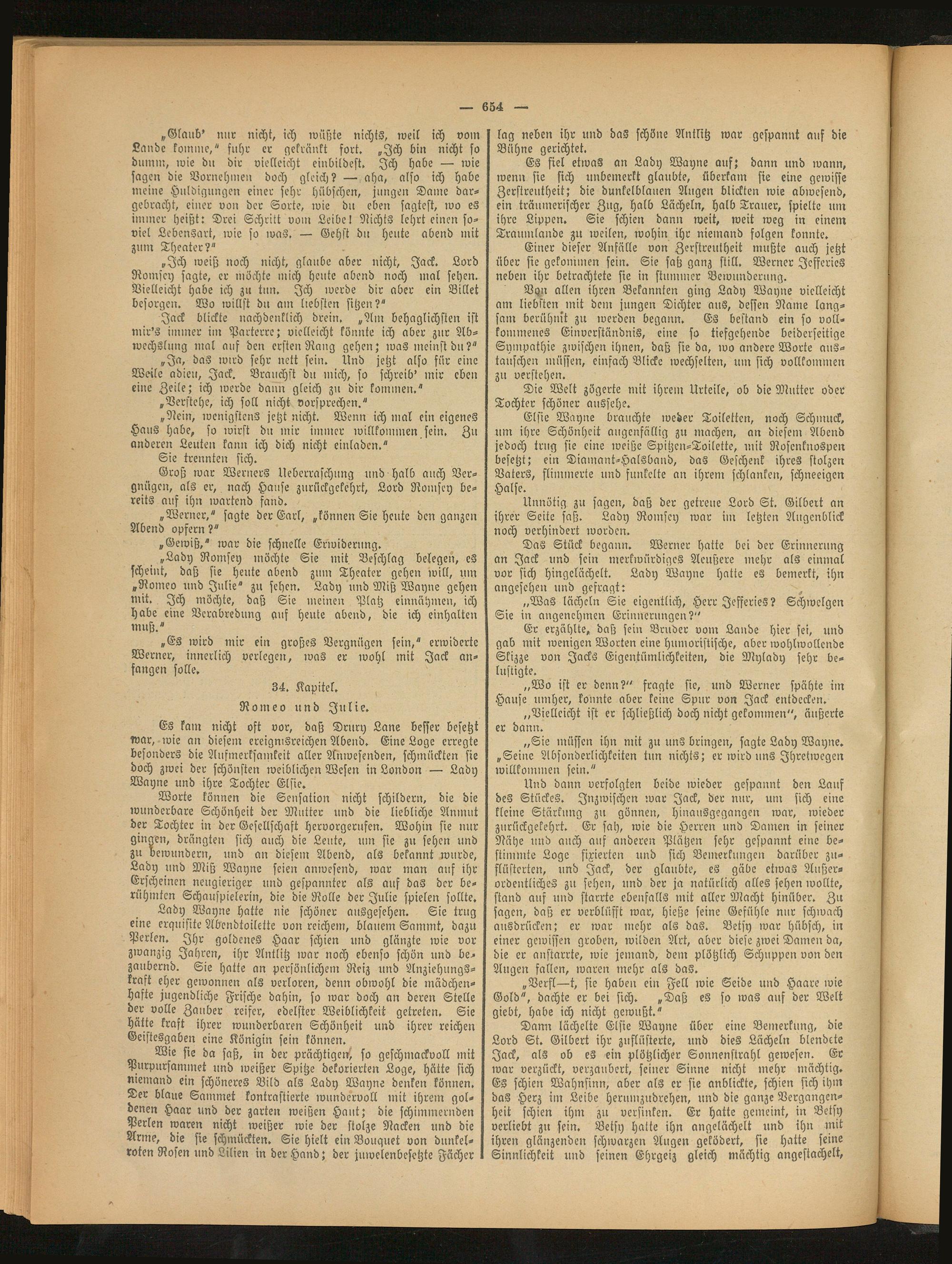 Worte können die Sensation nicht schildern, die die wunderbare Schönheit der Mutter und die liebliche Anmut der Tochter in der Gesellschaft hcrvorgerufen. Wohin sie nur gingen, drängten sich auch die Leute, uni sie zu sehen und zu bewundern, und an diesen: Abend, als bekannt wurde, Lady und Miß Wayne seien anwesend, war man auf ihr Erscheinen neugieriger und gespannter als auf das der berühmten Schauspielerin, die die Rolle der Julie spielen sollte.