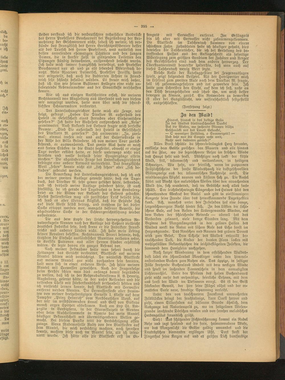 Leider verstand ich die verdeutschten technischen Ausdrücke des Herrn Professors Bouchacourt bei Begründung der Vermehrung der Geschworenen nicht, sodaß ich meinte, ich verstände das Französisch des Herrn Gerichtspräsidenten besser als das Deutsch des Herrn Professors, was natürlich von dessen anwesenden ehemaligen Schülern und den jungen Damen, die in starker Zahl in glänzenden Toiletten den Sitzungen ständig beiwohnten, entsprechend belacht wurde. Ich habe mich immer französisch verteidigt, und Professor Bouchacourt nur ab und zn als lebendes Wörterbuch benutzt. Mein Äjaccioer Dolmetsch, Professor Froissy, hatte mir mitgeteilt, daß auch die studierten Lehrer in Frankreich sehr schlecht besoldet würden. Es freute mich daher, daß ich ihm wie seinem Bastiauer Kollegen eine nicht un- bedeutende Nebeneinnahme aus der Staatskasse verschaffen konnte.