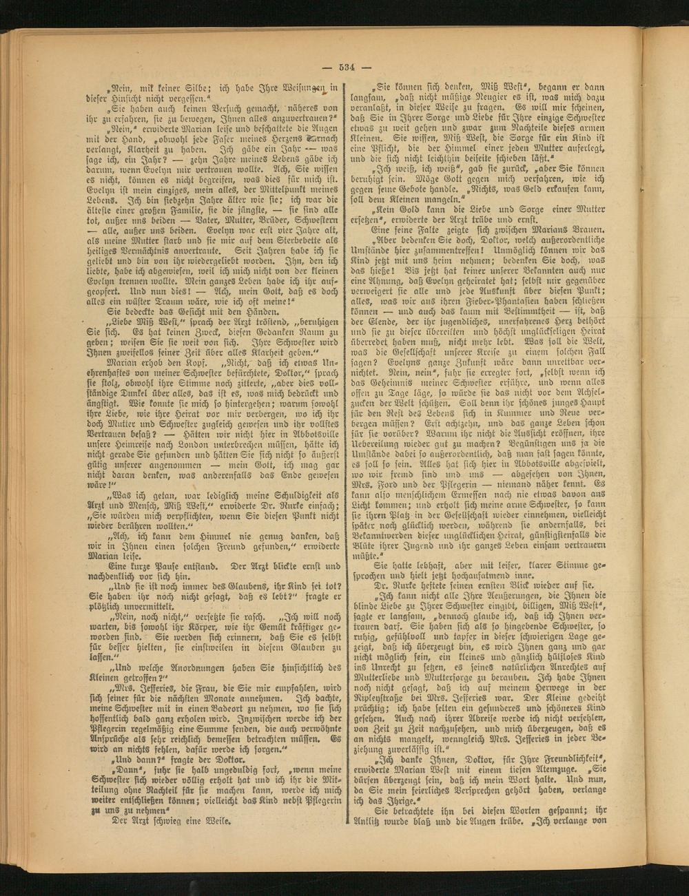 „Liebe Miß West," sprach der Arzt tröstend, „beruhigen Sie sich. Es hat keinen Zweck, diesen Gedanken Raum zu geben; weisen Sie sie weit von sich. Ihre Schwester wird Ihnen zweifellos seiner Zeit über alles Klarheit geben."