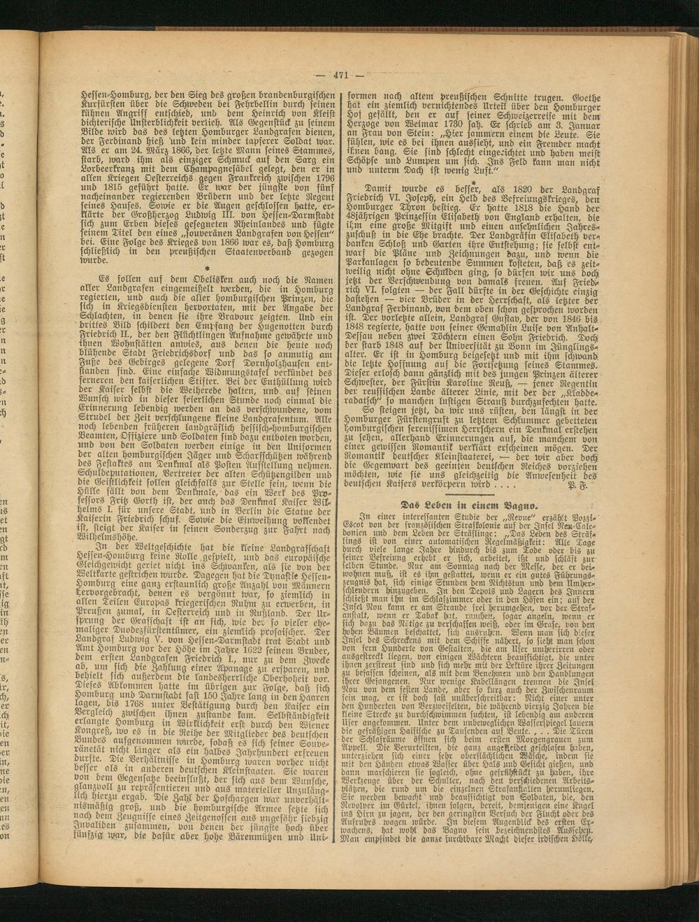 Hessen-Homburg, der den Sieg des großen brandenburgischen Kurfürsten über die Schweden bei Fehrbellin durch seinen kühnen Angriff entschied, und dem Heinrich von Kleist dichterische Unsterblichkeit verlieh. Als Gegenstück zu seinem Bilde wird das des letzten Homburger Landgrafen dienen, der Ferdinand hieß Und kein minder tapferer Soldat war. Als er am 24. März 1866, der letzte Mann seines Stammes, starb, ward ihm als einziger Schmuck auf den Sarg ein Lorbeerkranz mit dem Champagnesäbel gelegt, den er in allen Kriegen Oesterreichs gegen Frankreich zwischen 1796 und 1815 geführt hatte. Er war der jüngste von fünf nacheinander regierenden Brüdern und der letzte Regent seines Hauses. Sowie er die Augen geschlossen hatte, erklärte der Großherzog Ludwig III. von Hessen-Darmstadt sich zum Erben dieses gesegneten Rheinlandes und fügte seinem Titel den eines „souveränen Landgrafen von Hessen" bei. Eine Folge des Krieges von 1866 war es, daß Homburg schließlich in den preußischen Staatenverbano gezogen wurde.