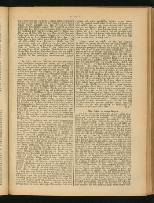 So steigen jetzt, da wir uns rüsten, den längst in. der Homburger Fürstengruft zu letztem Schlummer gebetteten homburgischen serenissimen Herrschern ein Denkmal erstehen zu sehen, allerhand Erinnerungen auf, die manchem von einer gewissen Romantik verklärt erscheinen mögen. Der Romantik deutscher Kleinstaaterei, — der wir aber doch die Gegenwart des geeinten deutschen Reiches vorziehcn möchten, wie sie uns gleichzeitig die Anwesenheit des deutschen Kaisers verkörpern wird .... Pi. F.