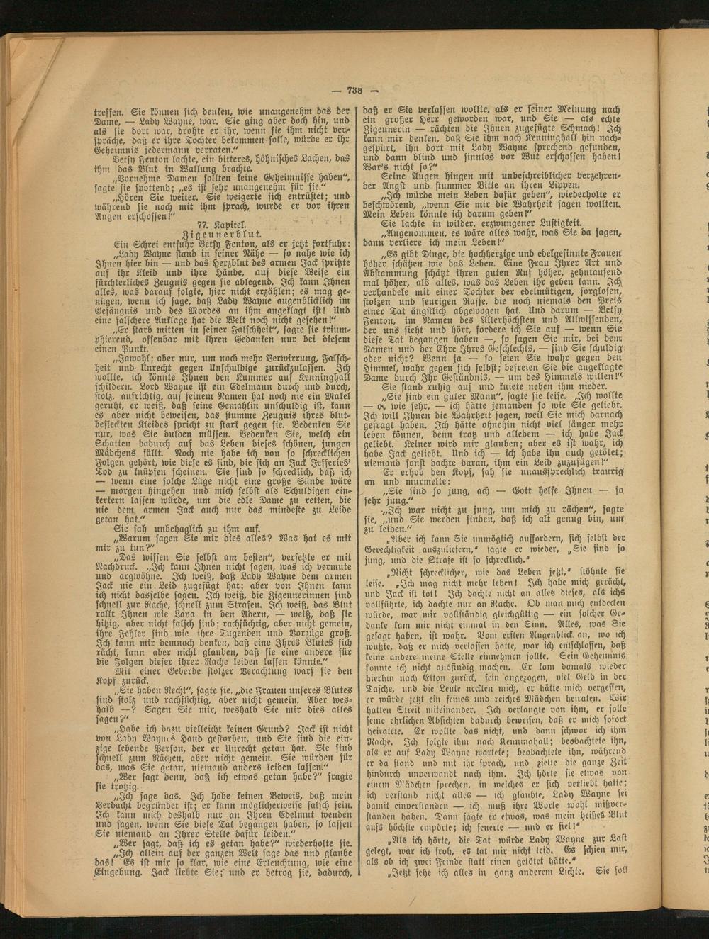 „Lady Wayne stand in seiner Nähe — so nahe wie ich Ihnen hier bin — und das Herzblut des armen Jack spritzte aus ihr Kleid und ihre Hände, aus diese Weise ein fürchterliches Zeugnis gegen sie ablegend. Ich kann Ihnen alles, was darauf folgte, hier nicht erzählen; es mag genügen, wenn ich sage, daß Lady Wayne augenblicklich im Gefängnis und des Mordes an ihm angeklagt ist! Und eine falschere Anklage hat die Welt noch nicht gesehen!"