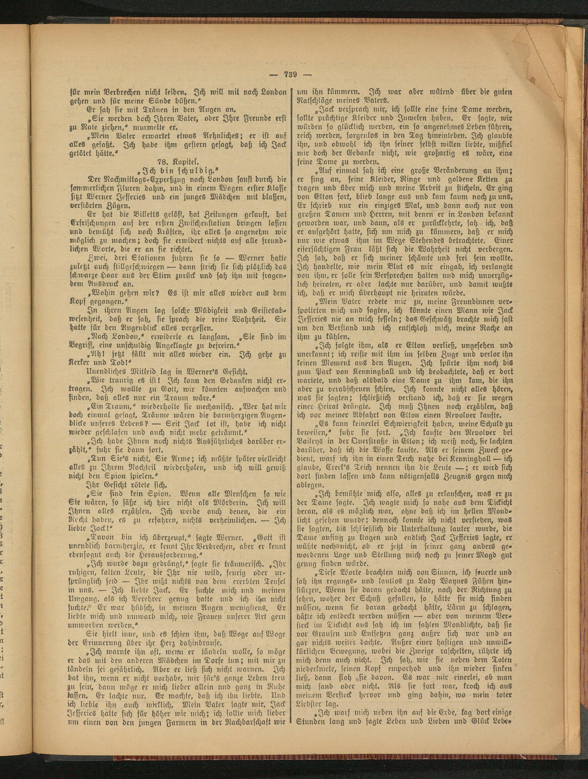 „Ich warnte ihn oft, wenn er tändeln wolle, so möge er das mit den anderen Mädchen im Dorfe tun; mit mir zu tändeln sei gefährlich. Aber er ließ sich nicht warnen. Ich bat ihn, wenn er nicht vorhabe, mir für's ganze Leben treu zu sein, dann möge er mich lieber allein und ganz in Ruhe taffen. Er lachte nur. Er machte, daß ich ibn liebte. Und ich liebte ihn auch wirklich. Mein Vater sagte mir, Jack Jefferies halte sich für höher wie mich; ich sollte mich lieber um einen von den jungen Farmern in der Nachbarschaft wie