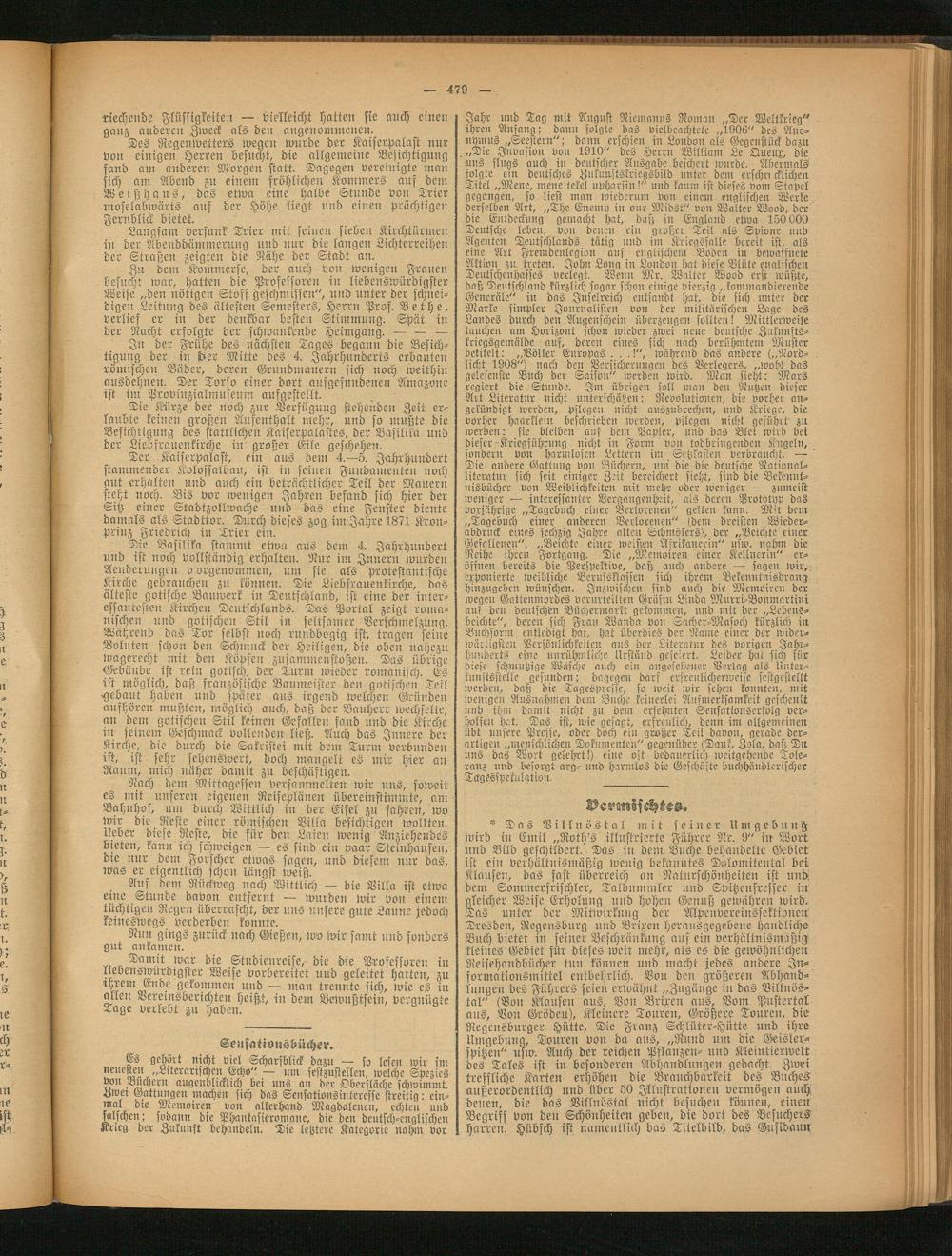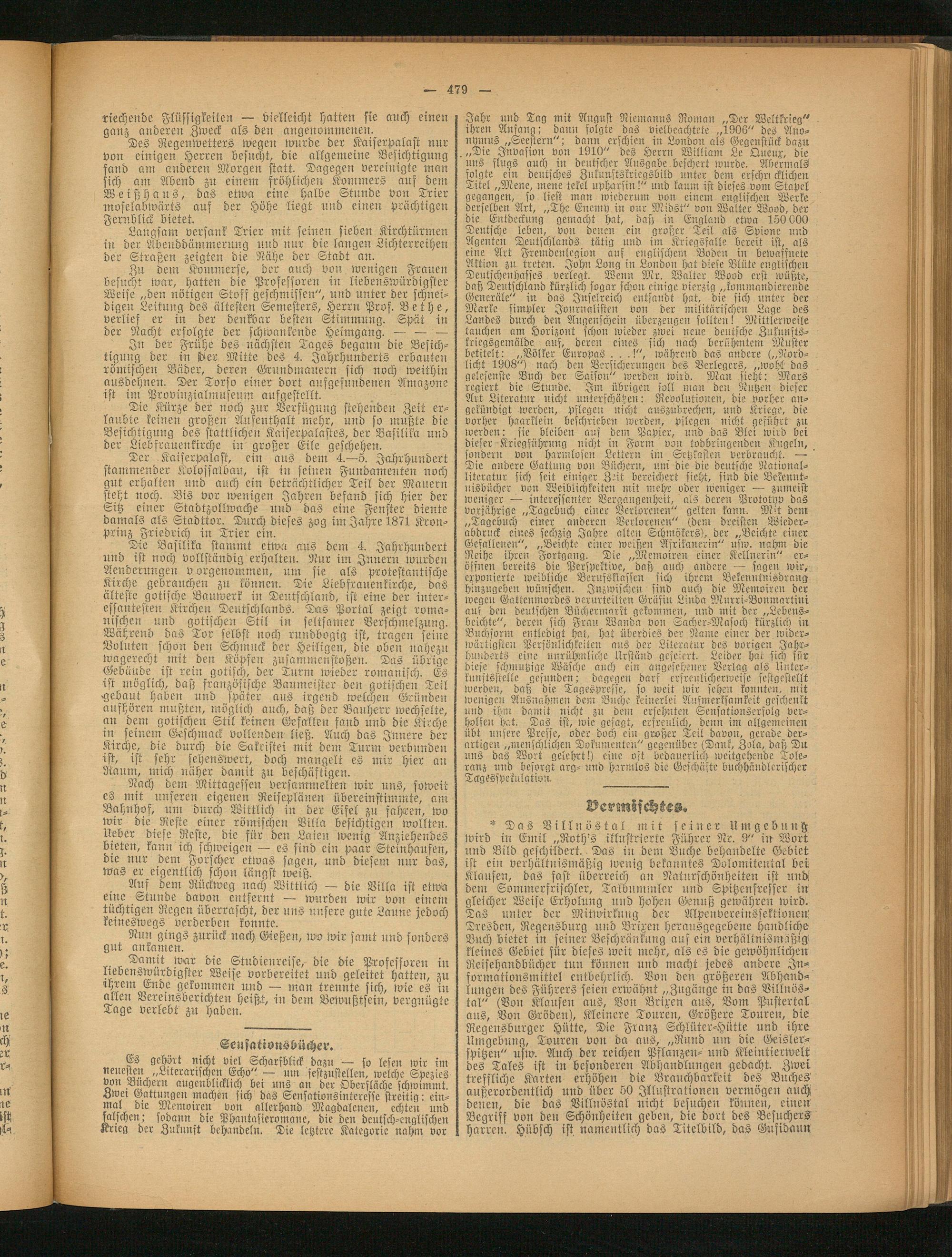 Gä gehört nicht viel Scharfblick dazu — so lesen wir im Quecken „Literarischen Echo" — um sestzustellen, welche Spezies von Buchern augenblicklich bei uns an der Oberfläche schwimmt. Zwei Gattungen machen sich das Seusatiousiniercssc streitig: ein- mal die Memoiren von allerhand Magdalenen, echten und falschen; sodann die Phantasieromane, die den deutsch-englischen Krieg der Zukunft behandeln. Die letztere Kategorie nahm vor