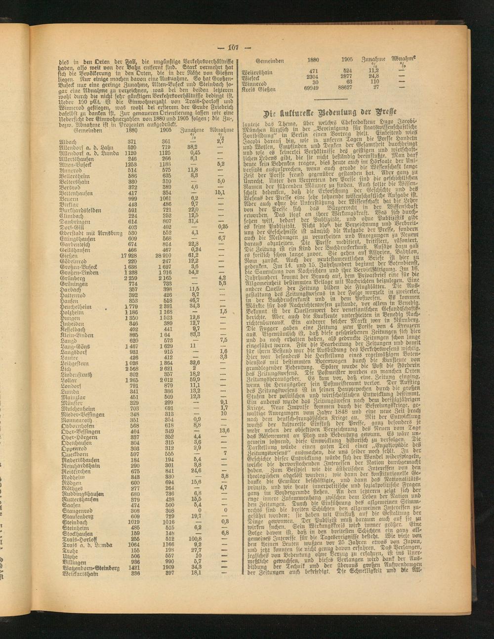 dies in den Orten der Fall, die ungünstige Verkehrsverhältnisse haben, also wett von der Bahn entfernt sind. Stark vermehrt hat sich die Bevölkerung in den Orten, die in der Rühe von Gießen liegen. Nur einige machen davon eine Ausnahme. So hat Großen- Bnseck nur eine geringe Zunahme, Alten-Buseck und Steinbach sogar eine Abnahme zu verzeichnen, was bei den beiden letzteren wohl durch die nicht sehr günstigen Verkehrsverhältnisse bedingt ist. lieber 100 pCt. ist die Einwohnerzahl von Trais-Horloff und Winnerod gestiegen, wa§ wohl bei ersterem der Grube Friedrich daselbst zii danken ist. Zur genaueren Orientierung lassen wir eine Üebersicht der Einwohnerzahlen von 1880 und 1905 folgen; die Zu-, bezw. Abnahme ist in Prozenten auSgedrückt.