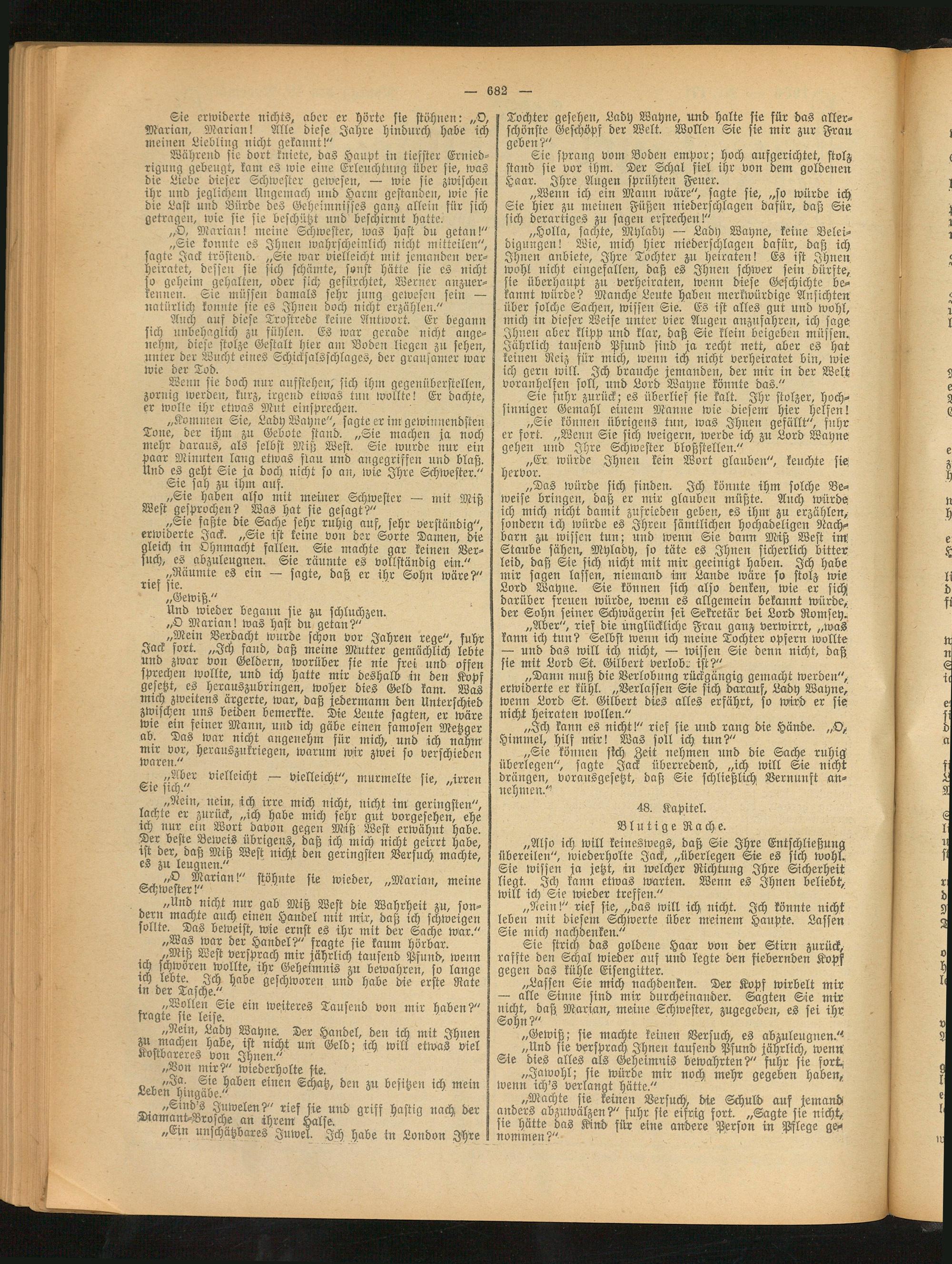 „Aber", rief die unglückliche Frau ganz verwirrt, „was kann ich tun? Selbst wenn ich meine Tochter opfern wollte, — und das will ich nicht, — wissen Sie denn nicht, daß sie mit Lord St. Gilbert verlobe ist?"