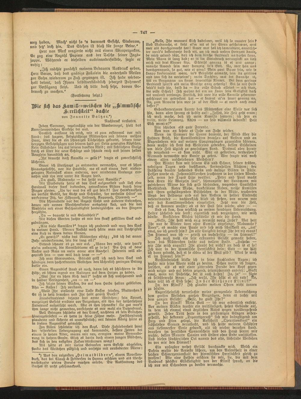 Gedankenverloren starrte das Mütterchen eine Weile vor sich hin, bann aber sprang es hastig auf: „Jesses, die Zeit geht ernm; ich muß mache, daß ich mein Kamille loswere; ich Han en weite, weite Heimweg. Adjes — un seid villmals bedankt! Halt Eich muntcr!"