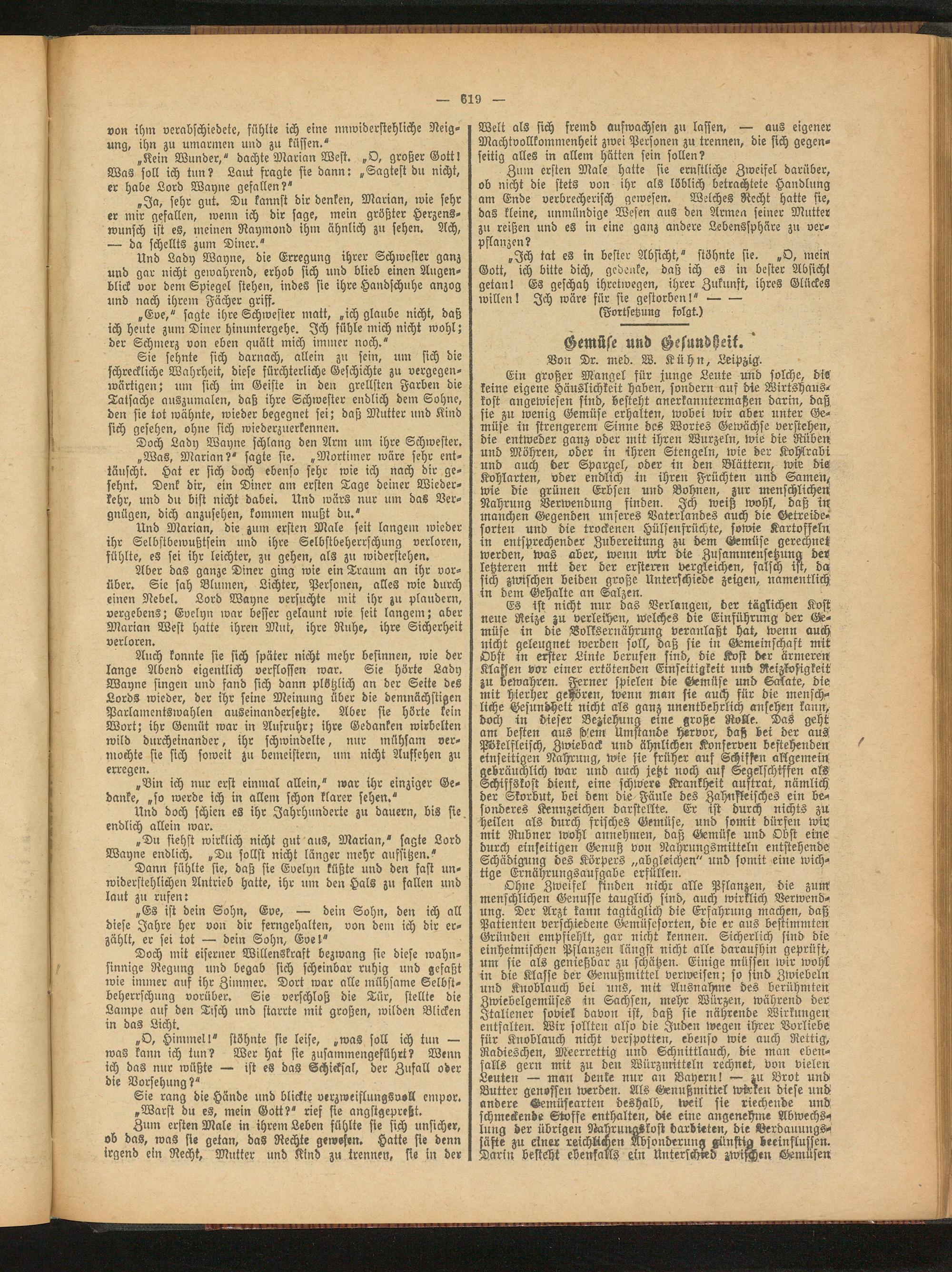 Ein großer Mängel für junge Leute und solche, drei feine eigene Häuslichkeit haben, sondern aus die Wirtshauskost angewiesen sind, besteht anerkanntermaßen darin, daß sie zu wenig Gemüse erhalten, wobei wir aber unter Gemüse in strengerem Sinne des Wortes Gewächse verstehen, die entweder ganz oder mit ihren Wurzeln, wie die Rüben und Möhren, oder in ihren Stengeln, wie der Kohlrabi und auch der Spargel, oder in den Blättern, wie dis Kohlarten, oder endlich in ihren Früchten und Samen/ wie die grünen Erbsen und Bohnen, zur menschlichen Nahrung Verwendung finden. Ich weiß wohl, daß in manchen Gegenden unseres Vaterlandes auch die Getreide» sorteu und die trockenen Hülsenfrüchte, sowie Kartoffeln in entsprechender Zubereitung zu dem Gemüse gerechnet werden, was aber, wenn wir die Zusammensetzung der letzteren mit der der ersteren vergleichen, falsch ist, da sich zwischen beiden große Unterschiede zeigen, namentlich in dem Gehalte an Salzen.