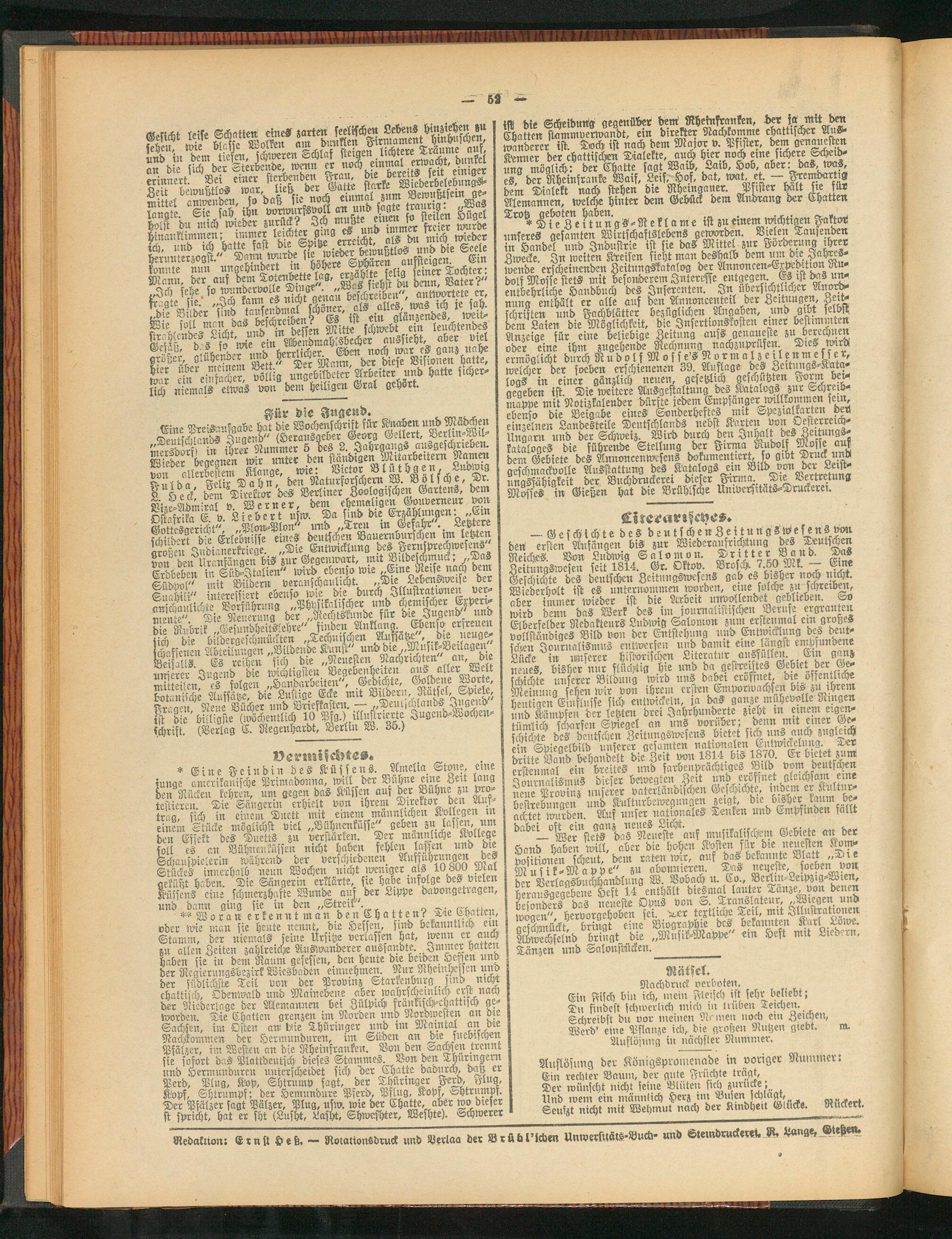 ist! die Scheidung gegenüber dem Rheinfranken, der ja mit dm Cbatten stammverwandt, ein direkter Nachkomme chattijchcr Aus» Wanderer ist. Doch ist nach dem Major v. Pfister, dem geniesten Kemier der chattifckien Dialekte, aum hwrnoch eine sichere una möglich: der Chatte sagt Wach, Lach, Hob, aber: das, was, es derRheinsranke Waif/LeifHof, bat, watet "F-emdarttg dem Dialekt nach stehen die Rhcmgauer. Poster halt sie sur Alemannen, welche hinter dem Gebück dem Andrang der Chatten $rÖ* äfX i?ungS-Reklame ist zu einem ivichtigen Faktor unseres gesamten Wirtschaftslebens geworden. Vielen Tagenden in Handel und Industrie ist sie das Mittel zur Forderung chr^r Zwecke. In weiten Kreisen sieht man deshalb dem mn diej Jahreswende erscheinenden ZeitungRatalog der Annoncen-Expedttlon mu dolf Moise stets mit besonderem Interesse entgegen Ls,ist das unentbehrliche Handbuch des Inserenten. In übersichtlicher Amnch- nung enthält er alle auf den Annoncenteil der Zeitungen, Zeitschriften und Fachblättcr bezüglichen, Angaben, und gibt elbst dem Laien die Möglichkeit, die Jnscrtwnskosten einer bestimmten Anzeige für eine beliebige Zeitung aufs genauere zu berechnen oder eine ihm zugehende Rechnung nachzuprufen. Die^> wiro ermöglicht durch Ru do l f M o ss e's N orm a l z e ilenm e ss er, welcher der soeben erschienenen 39. Auflage 2ettungs-Kata- logs in einer gänzlich neuen, gesetzlich geschützten Form bei gegeben ist. Die weitere Ausgestaltung des Katalogs zur Schreibmappe mit Notizkalender dürfte jedem Empfänger^willkommen sem ebenso die Beigabe eines Sonderheftes nut Dpezialkarten der! einzelnen Landesteile Deutschlands nebst Karten von Oesterreich- Ungarn und der Schlveiz. Wird durch den Inhalt des Zcttungs- kataloges die führende Stellung der Firma Rudolf Mosse aus dem Gebiete des Amivncenwesciis dokumentiert, so gibt Druck unv geschmackvolle Ausstattung des.Katalogs ein Bild.von der Leistungsfähigkeit der Buchdrucker« dieser ^Firma. Dle Vertretung MosseS in Gießen hat die Brühlsche Uiuvcriitäts-Druckerei.