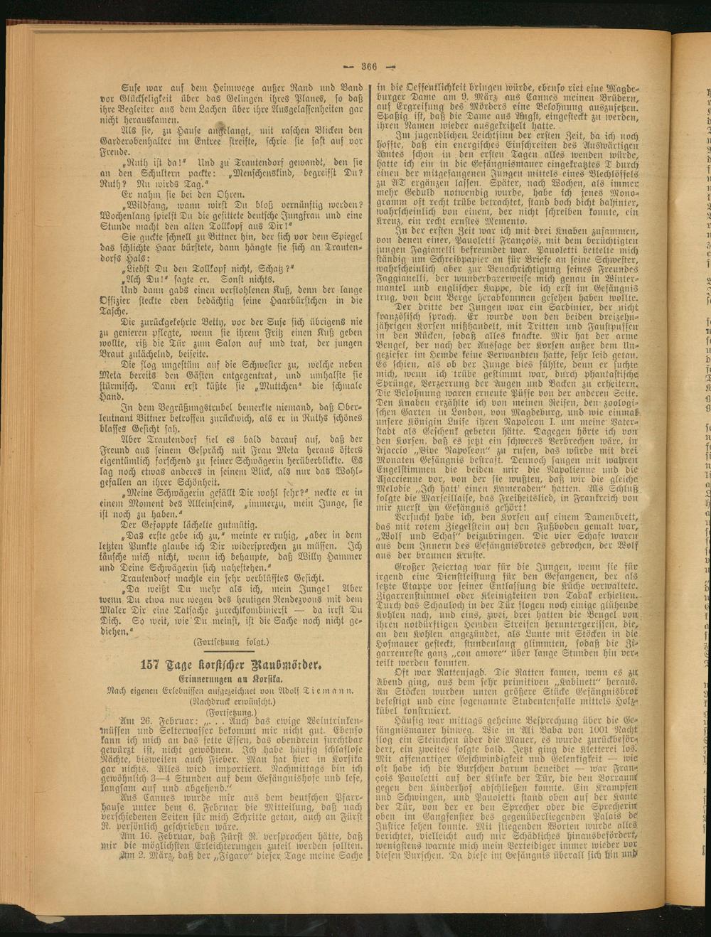 Am 26. Februar: „. . . Auch das ewige Wenttrmken- müssen und Selterwasser bekommt mir nicht gut. Ebenso kann ich mich an das fette Essen, das obendrein furchtbar gewürzt ist, nicht gewöhnen. Ich habe häufig schlaflose Nächte, bisweilen auch Fieber. Man hat hier in Korsika gar nichts. Alles wird importiert. Nachmittags bin ich gewöhnlich 3—4 Stunden aus dem Gefänguishofe und lese, langsam auf und abgehend."
