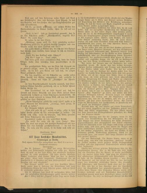 Der dritte der Jungen wär ein Sardinier, der nicht französisch sprach. Er wurde von den beiden dreizehnjährigen Korsen mißhandelt, mit Tritten und Fäustpuffcn in den Rücken, sodaß alles knackte. Mir hat der arme Bengel, der nach der Aussage der Korsen außer dem Ungeziefer int Hemde keine Verwandten hatte, sehr leid getan. Es schien, als ob der Junge dies fühlte, denn er suchte mich, wenn ich trübe gestimmt war, durch phantastische Sprünge, Verzerrung der Augen und Backen zu erheitern. Die Belohnung waren erneute Püffe von der anderen Seite. Den Knaben erzählte ich von meinen Reisen, den zoologischen Garten in London, von Magdeburg, und wie einmal! unsere Königin Luise ihren Napoleon I. um ntetne' Vaterstadt als Geschenk gebeten hätte. Dagegen hörte ich von den Korsen, daß es jetzt ein schweres Verbrechen ivärc, in Ajaccio „Bivc Napoleon" zu rufen, das würde mit drei Monaten Gefängnis bestraft. Dennoch sangen mit ivähren Engelflimmeit die beiden mir die Napölienne und die Ajaccienne vor, von der sie wüßten, daß wir die gleiche Melodie „Ich halt' einen Kameraden" hatten. Als Schluß, folgte die Marseillaise, das Freiheitslied, in Frankreich von mir zuerst ijm Gefängnis gehört!