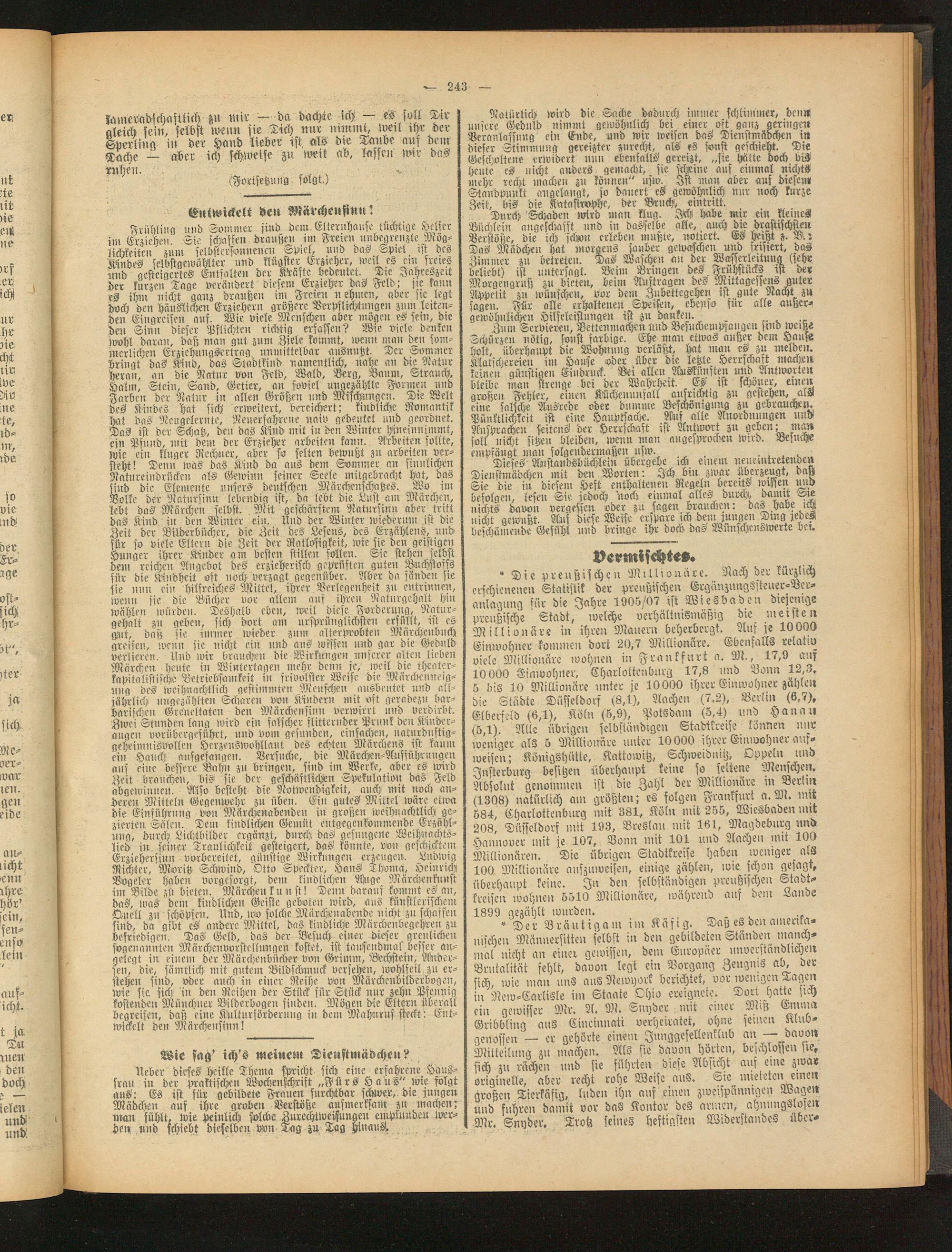 Natürlich wird die Sache dadurch immer schlimmer, denn unsere Geduld nimmt gewöhnlich bei einer ost ganz geringen Veranlassung ein Ende, und wir weisen das Dienstmädchen in dieser Stimmung gereizter zurecht, als es sonst geschieht. Die Gescholtene erwidert nun ebenfalls gereizt, „sie hätte doch bis heute cs nicht anders gemacht, sie Mine aus einmal nichts mehr recht machen zn können" nsw. Ist man aber auf diesem Standpunkt augelangt, so dauert es gewöhnlich nur noch kurze Zeit, bis die Katastrophe, der Bruch, eintritt.