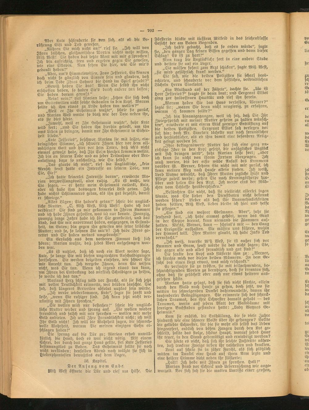 „Alles Lügen; Sie haben's getan!" schrie die unglückliche Mutter. „O, Miß West, Miß West! Habe ich das verdient? Sie sind zu mir gekommen in Ihrem Kummer und ich habe Ihnen geholfen, was ich nur konnte. Zwanzig, zwanzig lange Jahre habe ich für Sie gearbeitet, und das Kind, das Sie mir anvertraut haben, aufgezogen, in Gesundheit, im Guten; bin gegen ihn gewesen wie seine leibliche Mutter; und so, so lohnen Sie mir's! Ich habe Ihres gerettet und Sie haben meines umgebracht!"