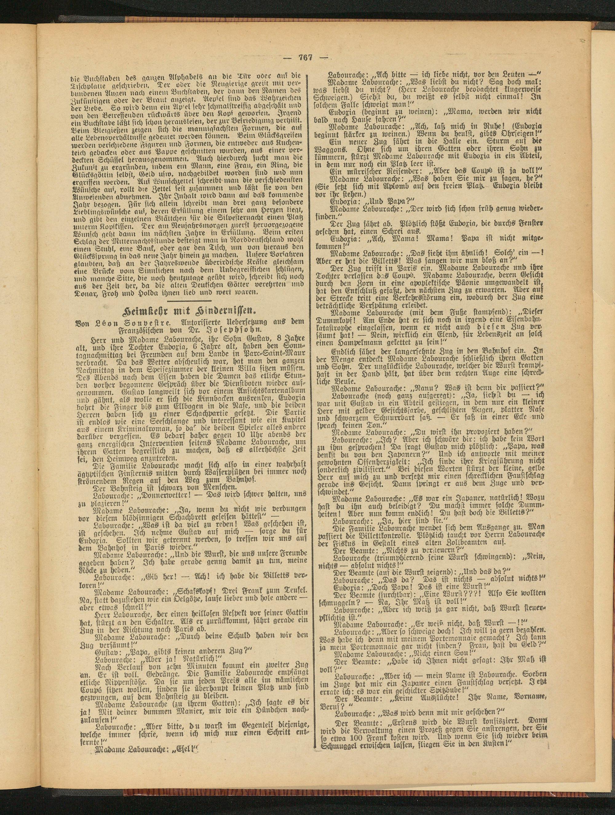 Herr und Madame Labourache, ihr Sohn Gustav, 8 Jahre alt, und ihre Tochter Eudoxia, 6 Jahre alt, haben den Sonntagnachmittag bei Freunden auf dem Lande in Parc-Samt-Maur verbracht. Da das Wetter abscheulich war, hat man den ganzen Nachmittag in dem Speisezintmer der kleinen Villa sitzen müssen. Des Abends nach dem Essen haben die Damen das etliche ©tun» den vorher begonnene Gespräch über die Dienstboten wieder auf- geiiommen. Gustav langlveilt sich vor einem Ansichtskartenalbum und gähnt, als ,volle er sich die Kinnbacken ausrenken, Eudoxia bohrt die Finger bis zum Ellbogen in die Nase, und die beiden Herren haben sich zu einer Schachpartie gesetzt.. Die Partie ist endlos wie eine Seeschlange und interessant wie em Kapitel aus einem Kriminalroman, so bar die beiden Spieler alles andere darüber vergessen. Es bedarf daher gegen 10 Uhr abends der ganz cnergischeil Intervention seitens Madame Labourache, um ihrem Gatten begreiflich zu machen, daß es allerhöchste Zett sei, den Heimiveg anzutreten. ,