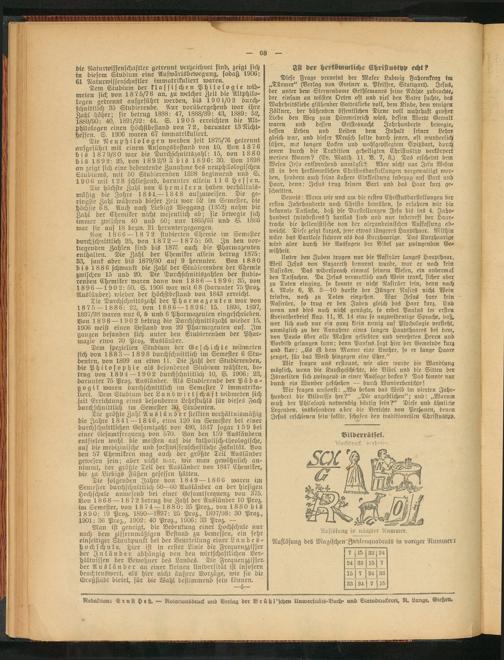 Von 1866 —18 72 studierten Chemie im Semester durchschnittlich) 25, von 1872 — 1875: 50. In den vorliegenden Zahlen sind bis 1875 auch die Pharmazeuten enthalten. Die Zahl der Chemiker allein betrug 1875: 33, sank aber bis 1879/80 auf 9 herunter. Von 188 0 bis 1886 schwankt die Zahl der Studierenden der Chemie zwischen 15 und 20. Die Durchschnittszahlen der studie- renden Chemiker waren dann von 1886 — 189 6: 35, von 1896 — 1902: 50. S. 1906 war mit 68 (darunter 75Proz. Ausländer) wieder der Höchstbestand von 1843 erreicht.