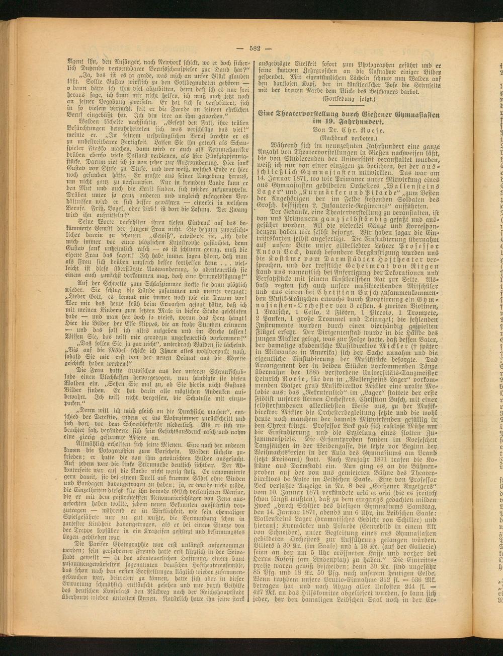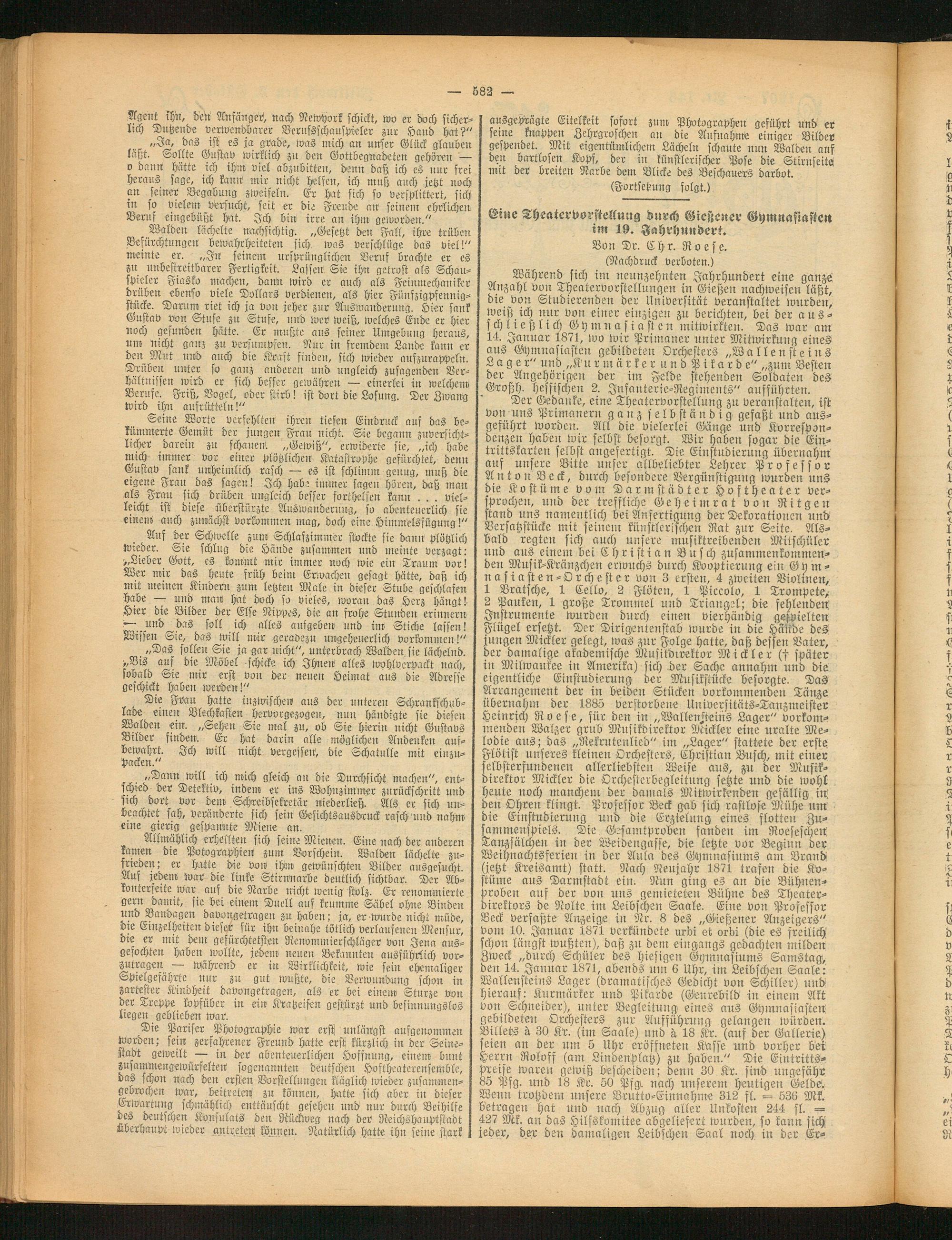 Der Gedanke, eine Theatervorstellung zu veranstalten, ist von uns Primanern ganz selbständig gefaßt und ausgeführt worden. All die vielerlei Gänge und Korrespondenzen haben wir selbst besorgt. Wir haben sogar die Eintrittskarten selbst angefertigt. Die Einstudierung übernahm auf unsere Bitte unser allbeliebter Lehrer Professor An ton Beck, durch besondere Vergünstigung wurden uns die Kostüme vom Darmstädter Hoftheater versprochen, und der treffliche Geheimrat von Ritgen stand uns namentlich bei Anfertigung der Dekorationen und Versatzstücke mit seinem künstlerischen Rat zur Seite. Alsbald regten sich auch unsere musiktreibenden Mitschüler und aus einem bei C h r i st i a n Busch zusammenkommenden Musik-Kränzchen erwuchs durch Kooptierung ein Gym- n a si ast en-Orchester von 3 ersten, 4 zweiten Violinen, 1 Bratsche, 1 Cello, 2 Flöten, 1 Piccolo, 1 Trompete, 2 Pauken, 1 große Trommel und Triangel; die fehlenden Instrumente wurden durch einen vierhändig gespielten Flügel ersetzt. Der Dirigentenstab wurde in die Häüde des jungen Wickler gelegt, was zur Folge hatte, daß dessen Vater, der damalige akademische Musikdirektor Mickler (f später in Milwaukee iu Amerika) sich.der Sache annahm und die eigentliche Einstudierung der Musikstücke besorgte. Das Arrangement der in beiden Stücken vorkommenden Tänze übernahm der 1885 verstorbene Universitäts-Tanzmeister Heinrich R o e s e, für den in „Wallen/teins Lager" vorkommenden Walzer grub Musikdirektor Mickler eine uralte Melodie aus; das „Rekrutenlied" im „Lager" stattete der erste Flötist uitseres kleinen Orchesters, Christian Busch, mit einer selbsterfundenen allerliebsten Weise aus, zu der Musikdirektor Mickler die Orchesterbegleitung setzte und die wohl heute noch manchenr der damals Mitwirkenden gefällig ist den Ohren klingt. Professor Beck gab sich rastlose Mühe um die Einstudierung und die Erzielung eines flotten Zusammenspiels. Die Gesamtproben fanden im Roeseschen Tanzsälchen in der Weideugasfe, die letzte vor Beginn der Weihnachtsferien in der Aula des Gymnasiums am Brand (jetzt Kreisamt) statt. Nach Neujahr 1871 trafen die Kostüme aus Darmstadt ein. Nun ging es an die Bühnenproben auf der von uns gemieteten Bühne des Theaterdirektors de Nolte im Leibschen Saale. Eine von Professor Beck verfaßte Anzeige in Nr. 8 des „Gießener Anzeigers" vom 10. Januar 1871 verkündete urbi et orbi (die es freilich schon längst wußten), daß zit dem eingangs gedachten milden Zweck „durch Schüler des hiesigen Gymnasiums Samstag, den 14. Januar 1871, abends um 6 Uhr, im Leibschen Saale: Wallensteins Lager (dramatisches Gedicht von Schiller) und hierauf: Kurmärker und Pikarde (Genrebild in einem Akt von Schneider), unter Begleitung eines aus Gymnasiasten! gebildeten Orchesters zur Aufführung gelangen würden. Billets ä 30 Kr. (im Saale) und ä 18 Kr. (auf der Gallerie) eien an der um 5 Uhr eröffneten Kasse und vorher bei xerrn Roloff (am Lindenplatz) zu haben." Die Eintrittspreise waren gewiß bescheiden; denn 30 Kr. sind ungefähr 85 Pfg. und 18 Kr. 50 Pfg. nach unserem heutigen Geldek Wenn trotzdem unsere Brutto-Einnahme 312 fl. = 536 Mk. betragen hat und nach Abzug aller Unkosten 244 fl. — 427 Mk. an das Hilfskomitee abgeliesert wurden, so kann sich jeder, der den damaligen Leibscheu Saal noch in der Er-