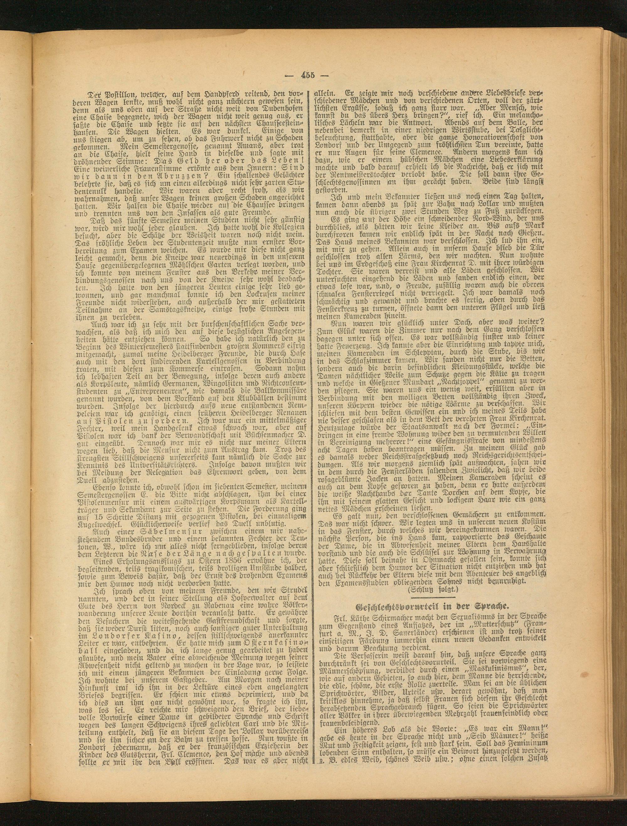 Frl. Käthe Schirmacher macht den Sexualismus in der Sprache zum Gegenstand eines Aufsatzes, der im „Mutterschutz (oran- fnrt a. M., I. D. Sauerländer) erschienen ist und trotz seiner einseitigen Färbung immerhin einen neuen Gedanken entwickelt und darum Beachtung verdient. „