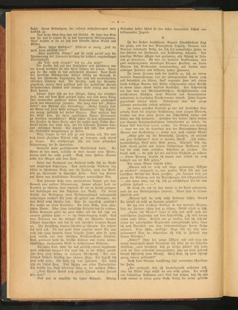 Ueber das Gutshaus von Balldorf senkte sich die Nacht und nächtliches Schweigen. Das fensterreiche Gebäude lag düster in schlafender Ruhe, nur ein Fenster, nach der Parkseite zu, schimmerte in schwacher Helle. Dort lag Hanna auf ihrem von blanseidenen Vorhängen umrauschten Bett.