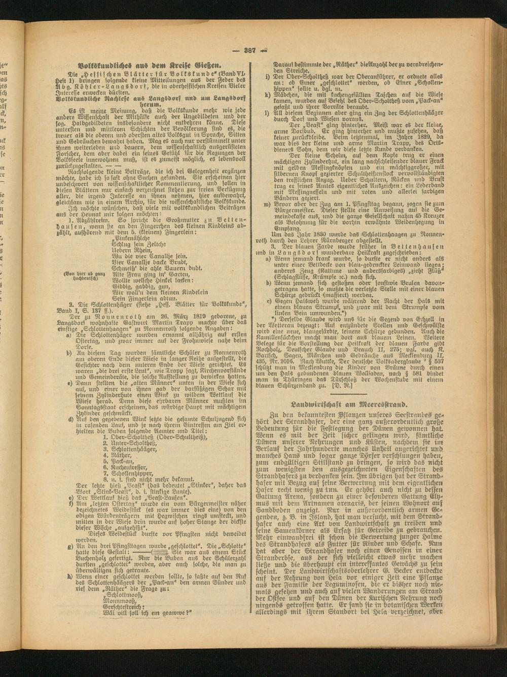Die „Hessischen Blätter f ü r Volkskunde" (BandVI- Heit 1) bringen solgende kleine Mitteilungen aus der Feder des A b g. Köhler-Langsdorf, die in oberhessischen Kreise«: Vieler Interesse erwecken dürsten.