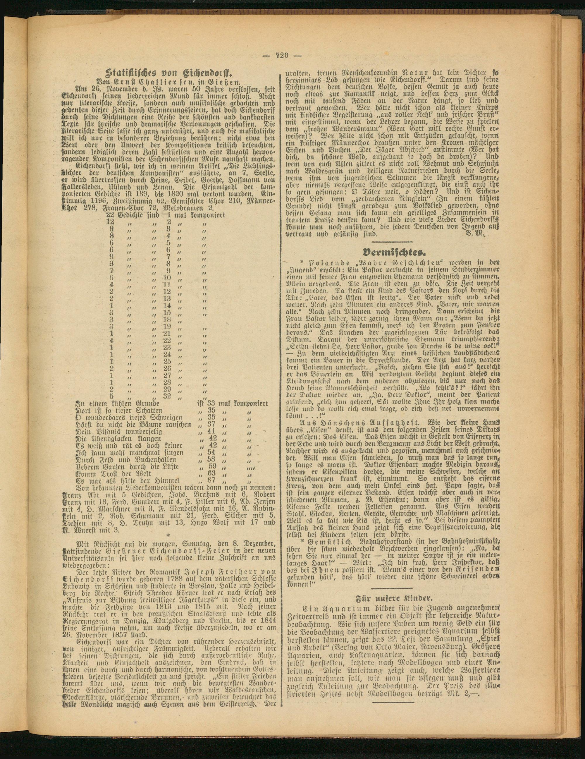 Eichendorfs steht, wie ich in meinem Artikel „Die Lieblings- Lichter der deutschen Komponisten" ausstihrte, an 7. Stelle, «r wird übertroffen durch Heine, Geibel, Goethe, Hofsmann von Fallersleben, Uhland und Lenau. Die Gesamtzahl der komponierten Gedichte ist 139, die 1820 mal vertont wurden. Einstimmig 1196, Zweistimmig 62, Gemischter Chor 210, Männer-