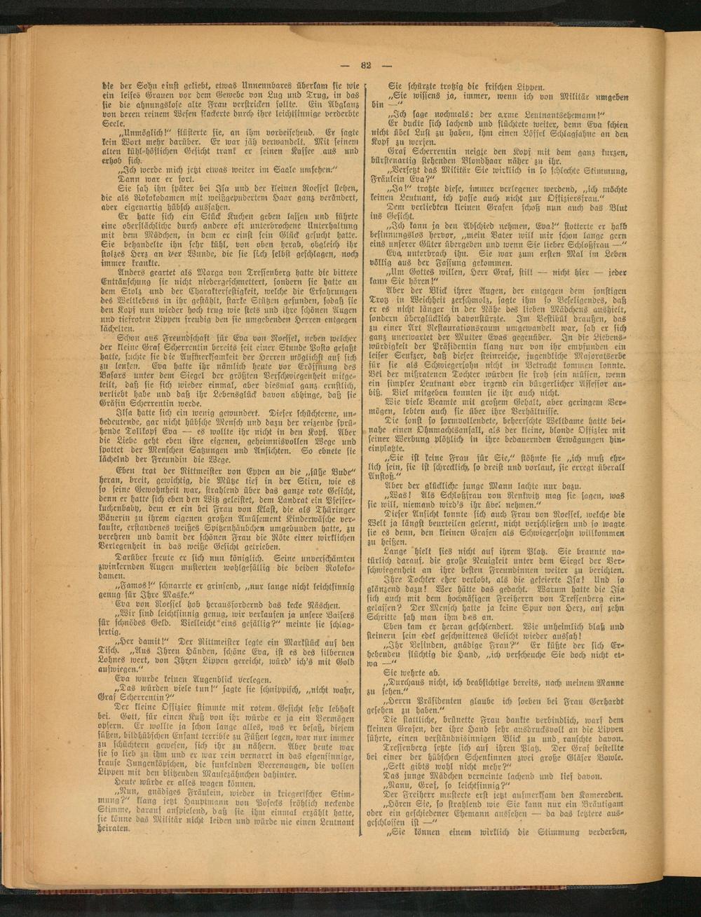 Schon aus Freundschaft für Eva von Roessel, neben welcher der kleine Gras Scherrentin bereits seit einer Stunde Posto gefaßt hatte, suchte sie die Aufmerksamkeit der Herren möglichst auf sich zu lenken. Eva hatte ihr nämlich heute vor Eröffnung des Basars unter dem Siegel der größten Verschwiegenheit mitge- teilt, daß sie sich wieder einmal, aber diesrual ganz ernstlich, verliebt habe und daß ihr Lebensglück davon nbhinge, daß sie Gräfin Scherrentin werde.