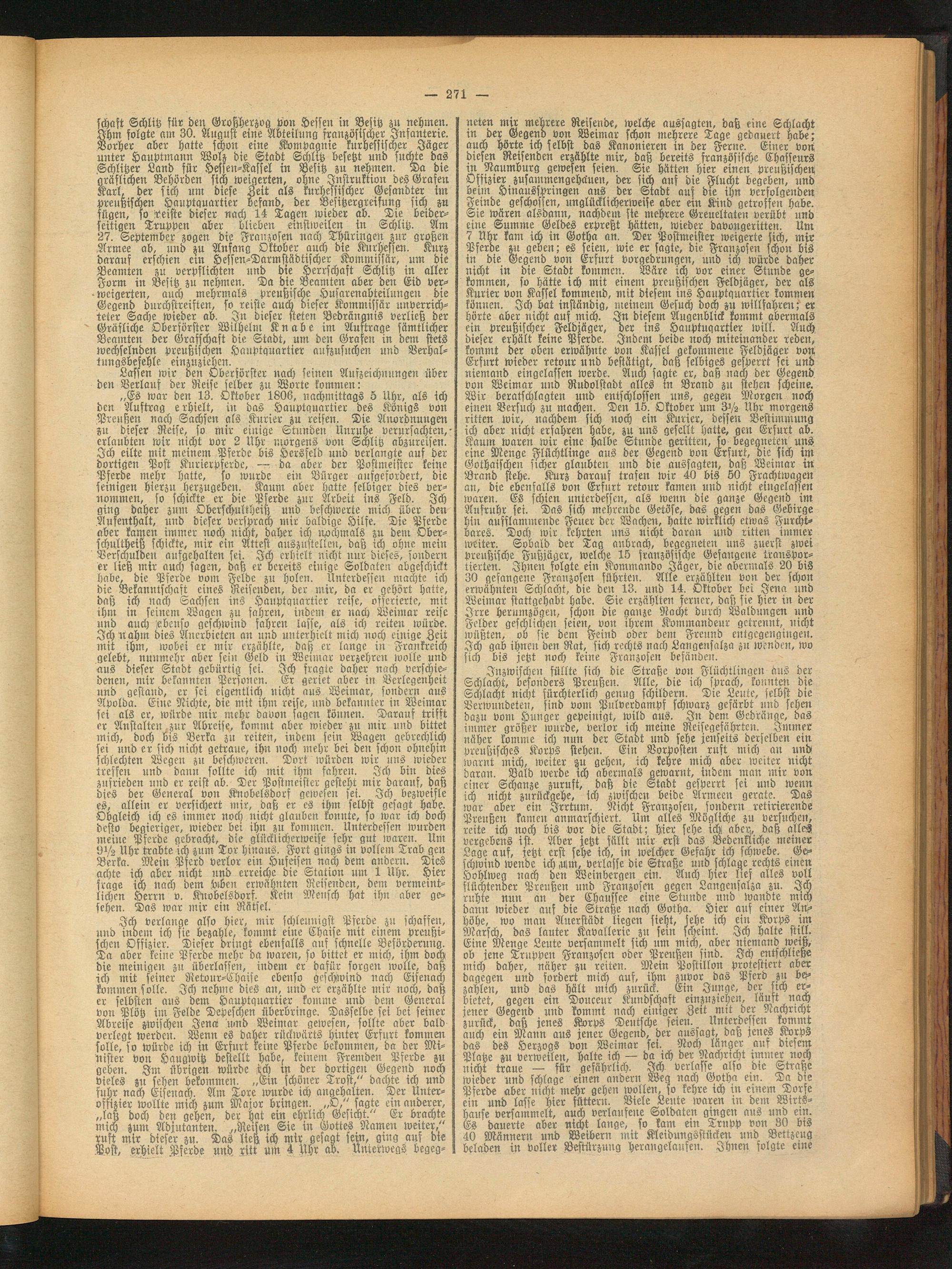 „Es war den 13. Oktober 1806, nachmittags 5 Uhr, als ich den Auftrag erhielt, in das Hauptquartier des Königs von Preußen nach Sachsen als Kurier zu reisen. Die Anordnungen zu dieser Reise, so mir einige Stunden Unruhe verursachten, - erlaubten wir nicht vor 2 Uhr morgens von Schlitz ahzureisen. Ich eilte mit meinem Pferde bis Hersfeld und verlangte auf der dortigen Post Kurierpferdc, — da aber der Postmeister keine Pferde mehr hatte, so wurde ein Bürger aufgefordert, die seinigen hierzu herzugeben. Kaum aber hatte selbiger dies vernommen, so schickte er die Pferde zur Arbeit ins Feld. Ich ging daher zum Oberschultheiß und beschlverte mich über den Aufenthalt, und dieser versprach mir baldige Hilfe. Die Pferde aber kamen immer noch nicht, daher ich nochmals zu dem Oberschultheiß schickte, mir ein Attest auszustelleu, daß ich ohne mein Verschulden aufgehalten sei. Ich erhielt nicht nnr dieses, sondern er ließ mir auch sagen, daß er bereits einige Soldaten abgeschickt habe, die Pferde vom Felde zu holen. Unterdessen machte ich die Bekanntschaft eines Reisenden, der mir, da er gehört hatte, daß ich nach Sachsen ins Hauptquartier reise, offerierte, mit ihm in feinem Wagen zu fahren, indem er nach Weimar reise und auch ießenfo geschwind fahren lasse, als ich reiten würde. Ith nahm dies Anerbieten an und unterhielt mich noch einige Zeit mit ihm, wobei er mir erzählte, daß er lange in Frankreich gelebt, nunmehr aber sein Geld in Weimar verzehren wolle und aus dieser Stadt gebürtijj sei. Ich fragte daher nach verschiedenen, mir bekannten Personen. Er geriet aber in Verlegenheit und gestand, er sei eigentlich nicht aus Weimar, sondern aus Apolda. Eine Nichte, die mit ihm reise, und bekannter in Weimar sei als er, würde mir mehr davon sagen können. Darauf trifft er Anstalten.zur Abreife, kommt aber wieder zu mir und bittet mich, doch bis Berka zu reiten, indem sein Wagen gebrechlich sei und er sich nicht getraue, ihn noch mehr bei den schon ohnehin schlechten Wegen zn beschweren. Dort würden wir uns wieder treffen und dann sollte ich mit ihm fahren. Ich bin dies zufrieden und er reist ab. Der Postmeister gesteht mir darauf, daß dies der General von Knobelsdorf gewesen sei. Ich bezweifle es, allein er versichert mir, daß er es ihm selbst gesagt habe. Obgleich ich es immer noch nicht glauben konnte, so war ich doch desto begieriger, wieder bei ihn zu kommen. Unterdessen wurden meine Pferde gebracht, die glücklicherweise sehr gut waren. Um 91/2 Uhr trabte ich zum Tor hinaus. Fort gings in vollem Trab gen Berka. Mein Pferd verlor ein Hnseisen nach dem andern. Dies achte ich aber nicht und erreiche die Station um 1 Uhr. Hier frage ich nach dem Men erwähnten Reisenden, deut vermeintlichen Herrn v. Knobelsdorf. Kein Mensch hat ihn aber gesehen. Das war mir ein Rätsel.